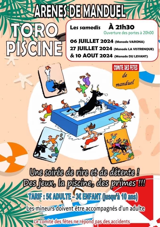 Samedi 9 août 21h30 🎉 Toro Piscine avec la Manade Gillet 🎟️ Adulte : 5€ | Enfants -10 ans : 3€
