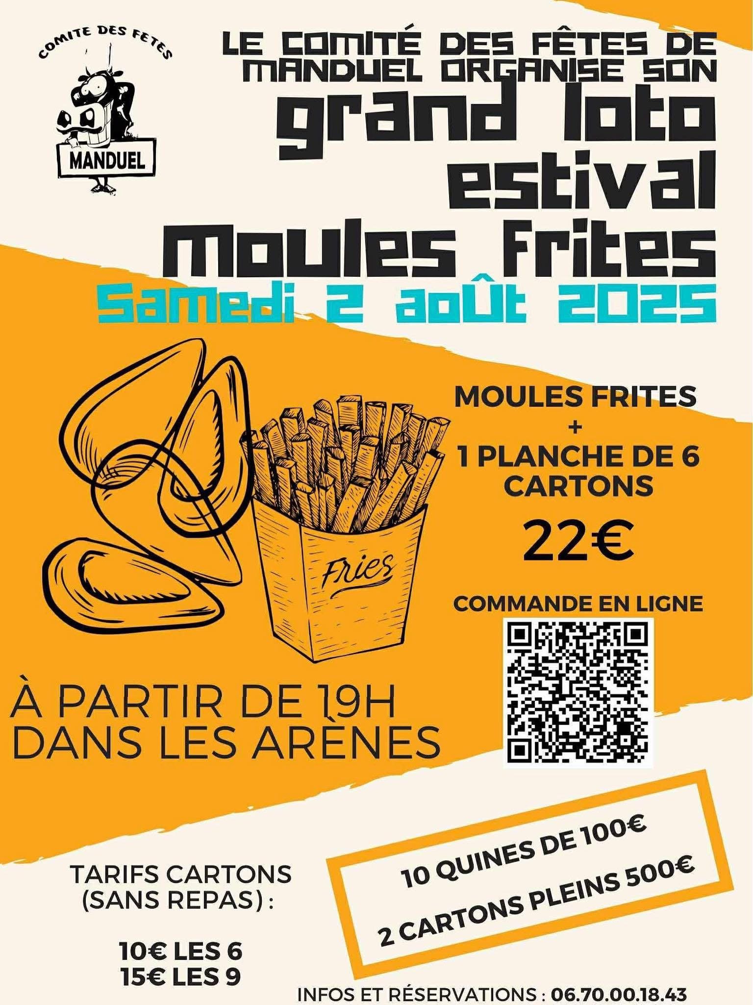 Samedi 2 août 2025 19h00 : Ouverture des portes 🎉 19h00 - 22h00 : Moules frites 🍽️ 19h30 : Début du grand loto estival 🎲