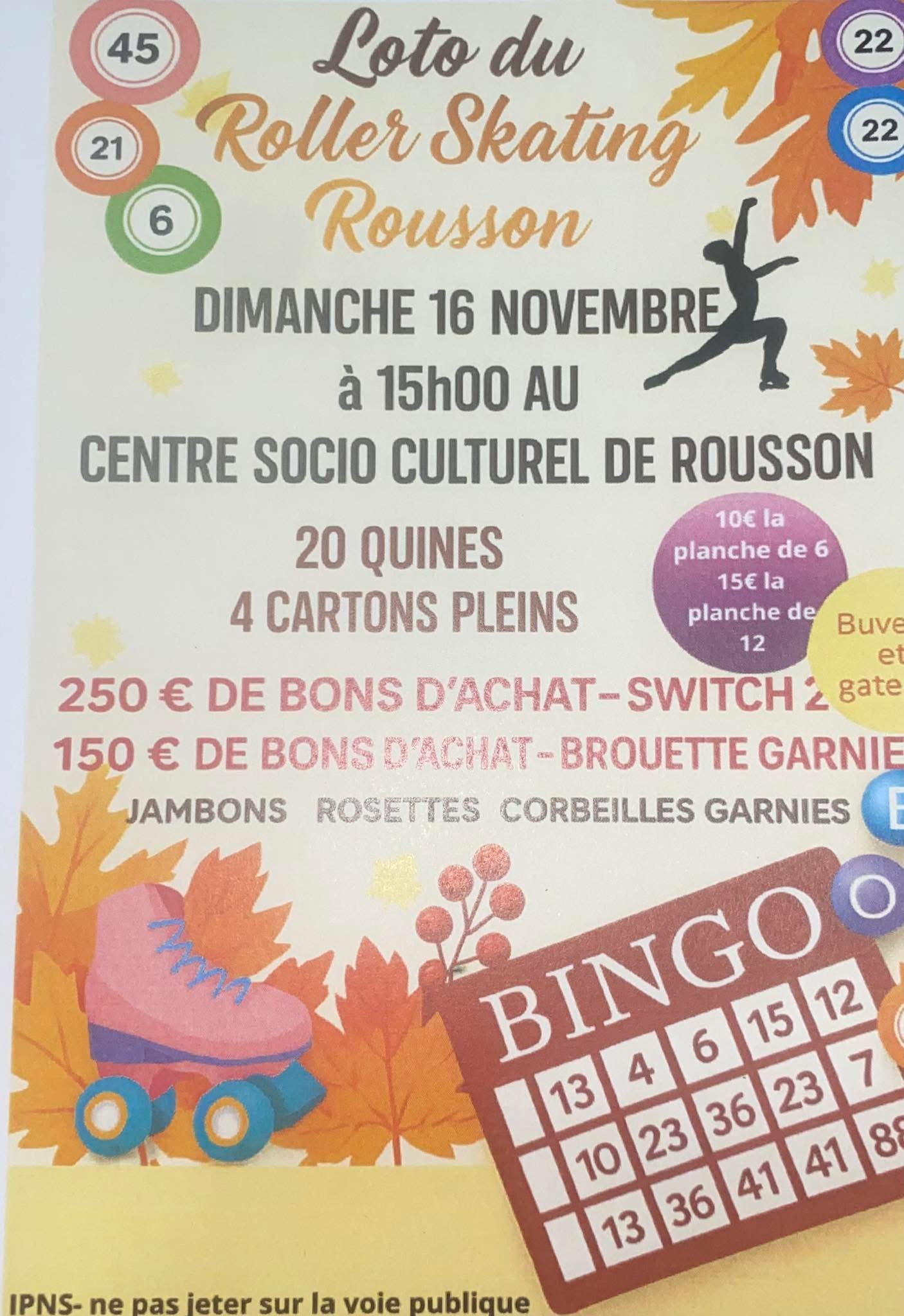 Dimanche 10 novembre 15H Loto : ROLLER SKATING Centre Socio de Rousson 20 Quines (panier garni, jambon...) 4 Cartons pion. (Bons d'achat, vélo) Tombola 10€ les 6 cartons 2 € le carton