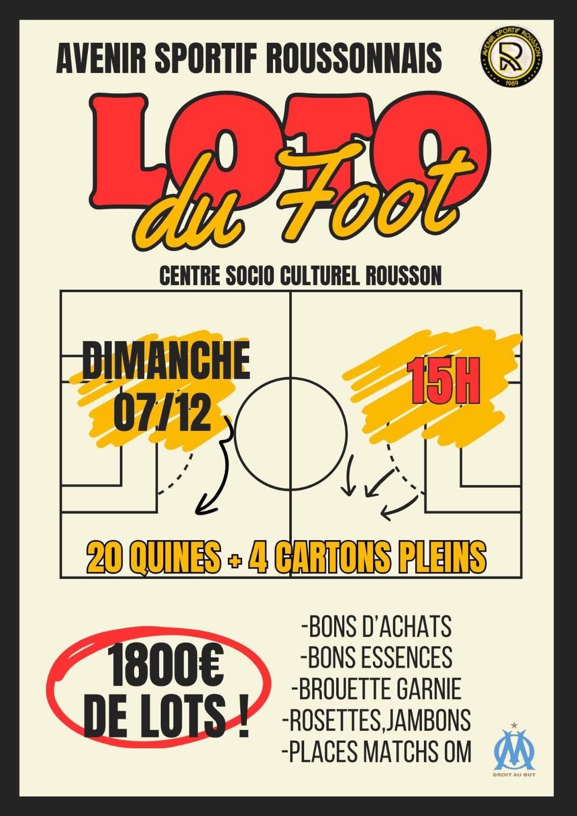 Dimanche 7 décembre 15h00 : Loto du Foot 🎉⚽ 20 Quines + 4 Cartons Pleins 🎟️ 1800€ de lots à gagner 💰 Lots : Bons d'achats, bons essences, brouette garnie, rosettes, jambons, places matchs OM 🎁