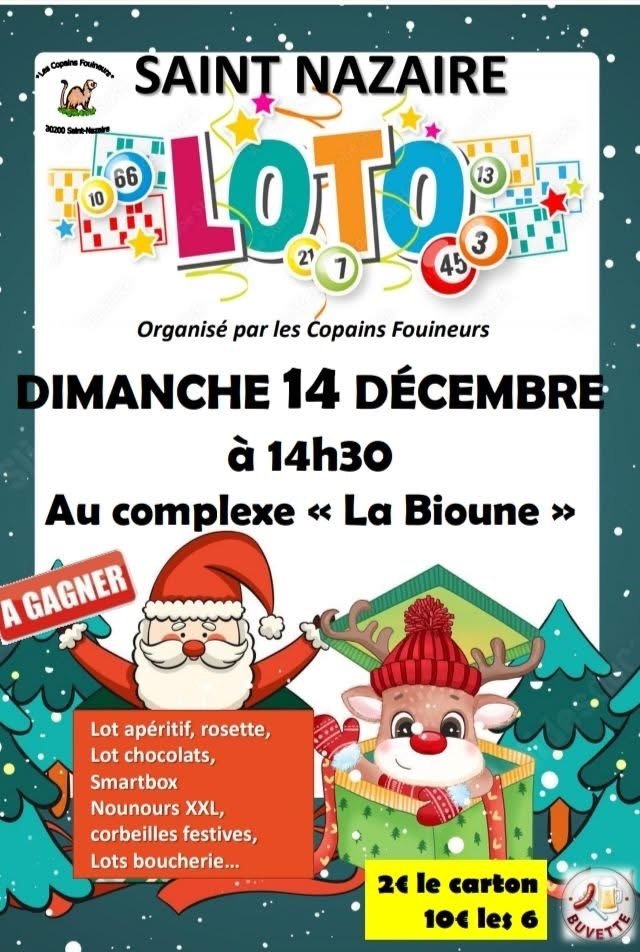 Dimanche 14 décembre 14h30 : Début du loto 🎉 Lots à gagner : Lot apéritif, rosette, lot chocolats, Smartbox, nounours XXL, corbeilles festives, lots boucherie 🎁