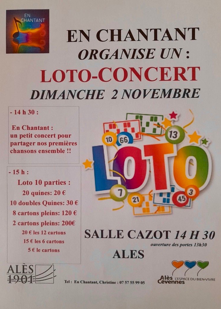 Dimanche 2 novembre 14h30 : 🎵 En Chantant : un petit concert pour partager nos premières chansons ensemble ! 15h00 : 🎉 Loto 10 parties 20 quines: 20 € 10 doubles Quines: 30 € 8 cartons pleins: 120 € 2 cartons pleins: 200 €