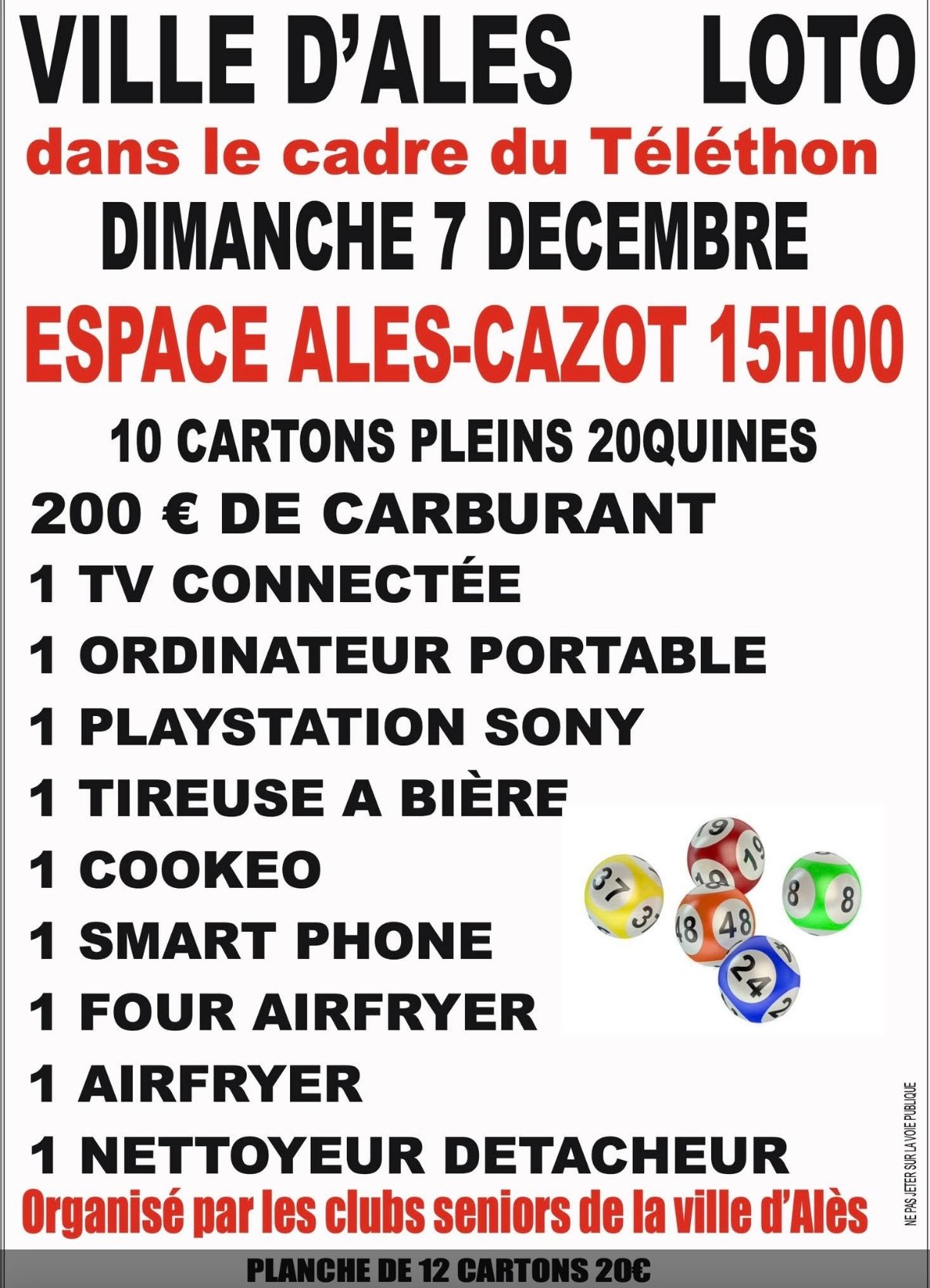 Loto à Alès le dimanche 8 décembre à 14h Ouverture des portes à partir de 13h Grand loto en faveur du Téléthon 2.5€ le carton 12 les 6 cartons 15 les 8 cartons Nombreux lots dont Robot Pâtissier, friteuse Air Frayeur, 1 jambon cru, saucisson rosette, corbeilles et sacs garnis, bons d'achats Dernier carton plein avec lot surprise Tombola à l'entracte Buvette avec boisson chaude et froide Pâtisseries, crêpes