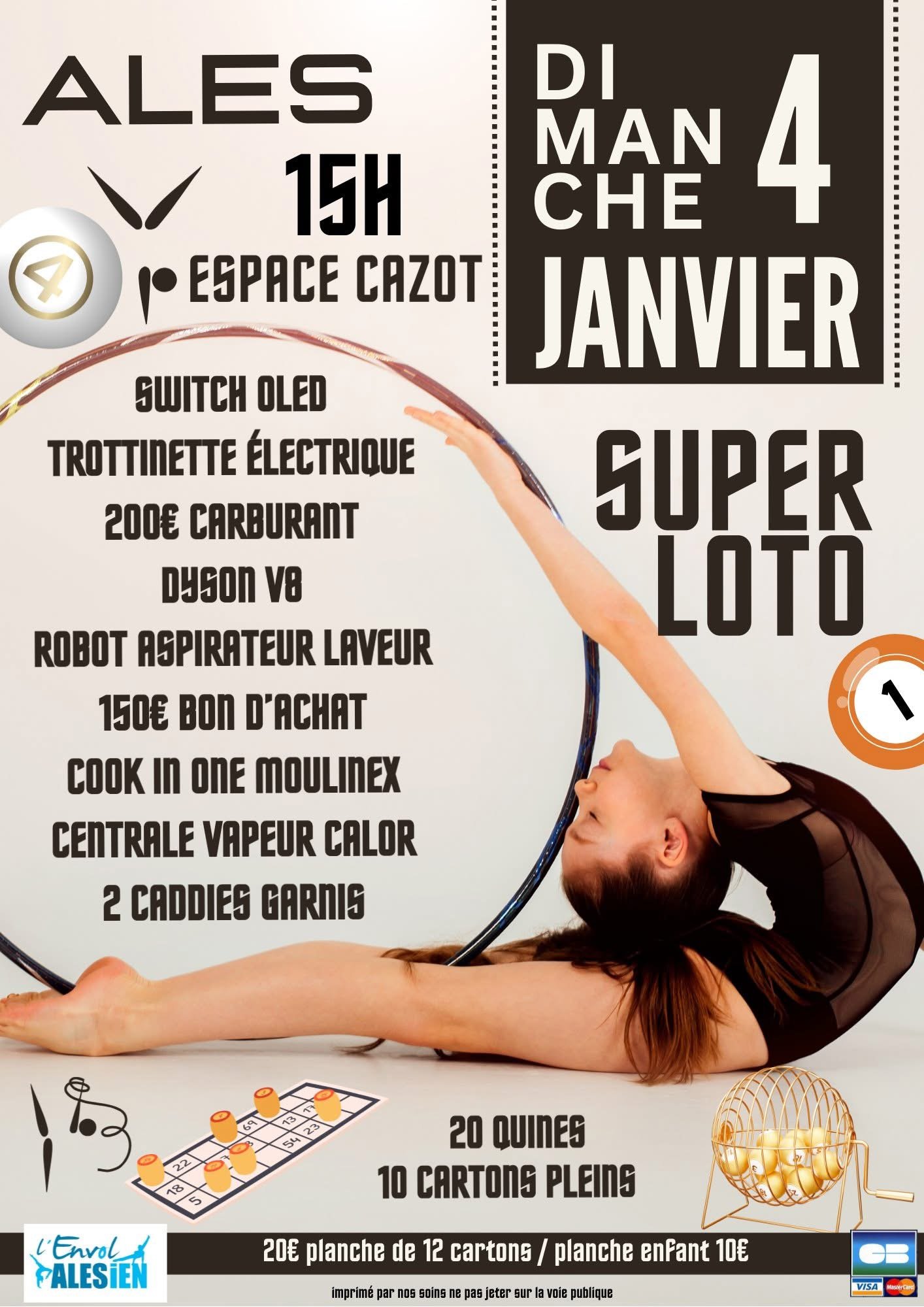 Dimanche 5 janvier 2025 15H : Grand Loto Espace Ales-Cazot 20 QUINES + 4 cartons pleins 1 caddie garni Des bons de carburant Appareils ménagers, téléviseur, etc 12€ les 8 cartons Super Tombola