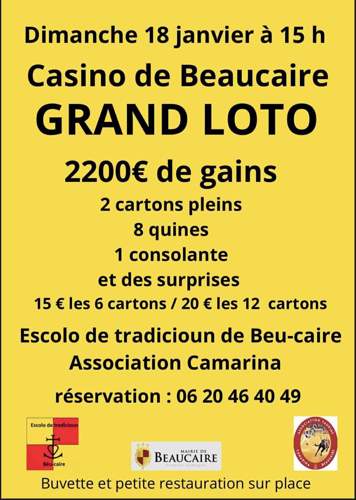 Dimanche 18 Janvier 2026 15:00 - 🎉 Grand Loto au Casino de Beaucaire 💰 2200€ de gains 🃏 2 cartons pleins 🎱 8 quines 🎁 1 consolante et des surprises 💸 15 € les 6 cartons / 20 € les 12 cartons 🍽️ Buvette et petite restauration sur place