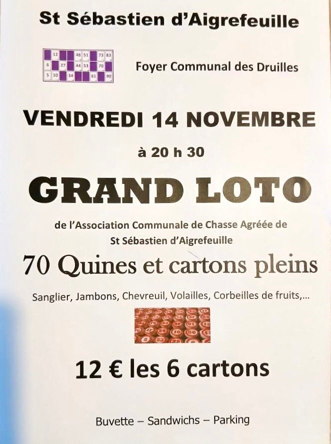 Vendredi 14 novembre 20h30 : 🎉 Grand Loto avec 70 Quines et cartons pleins 🍽️ Dégustation : Sanglier, Jambons, Chevreuil, Volailles, Corbeilles de fruits 🔥 Buvette et Sandwichs disponibles 🚗 Parking gratuit