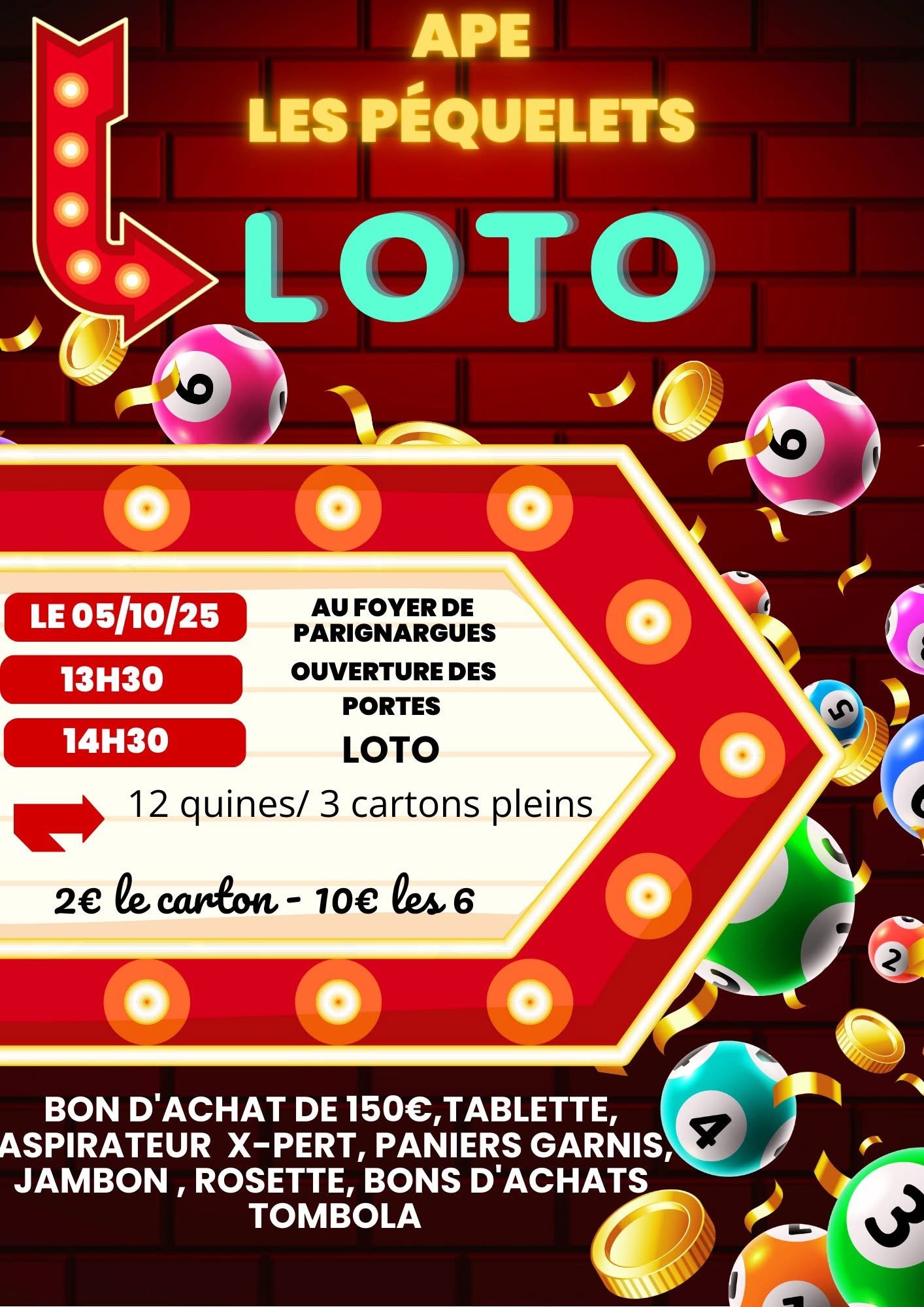 Dimanche 30 novembre 2025 14h30 : Début du Loto 🎉 Lots à gagner : Machine à café ☕ Bons d'achats 💳 Lot bien-être 🌿 Paniers garnis 🧺 Entrées parcs/cinéma 🎟️ Aspirateur Rowenta 🧹 Centrale vapeur 🔥 Bon d'achat 150€ 💰... Tarifs : 2€ le carton /10€ les 6 3 cartons pleins / 12 Quines
