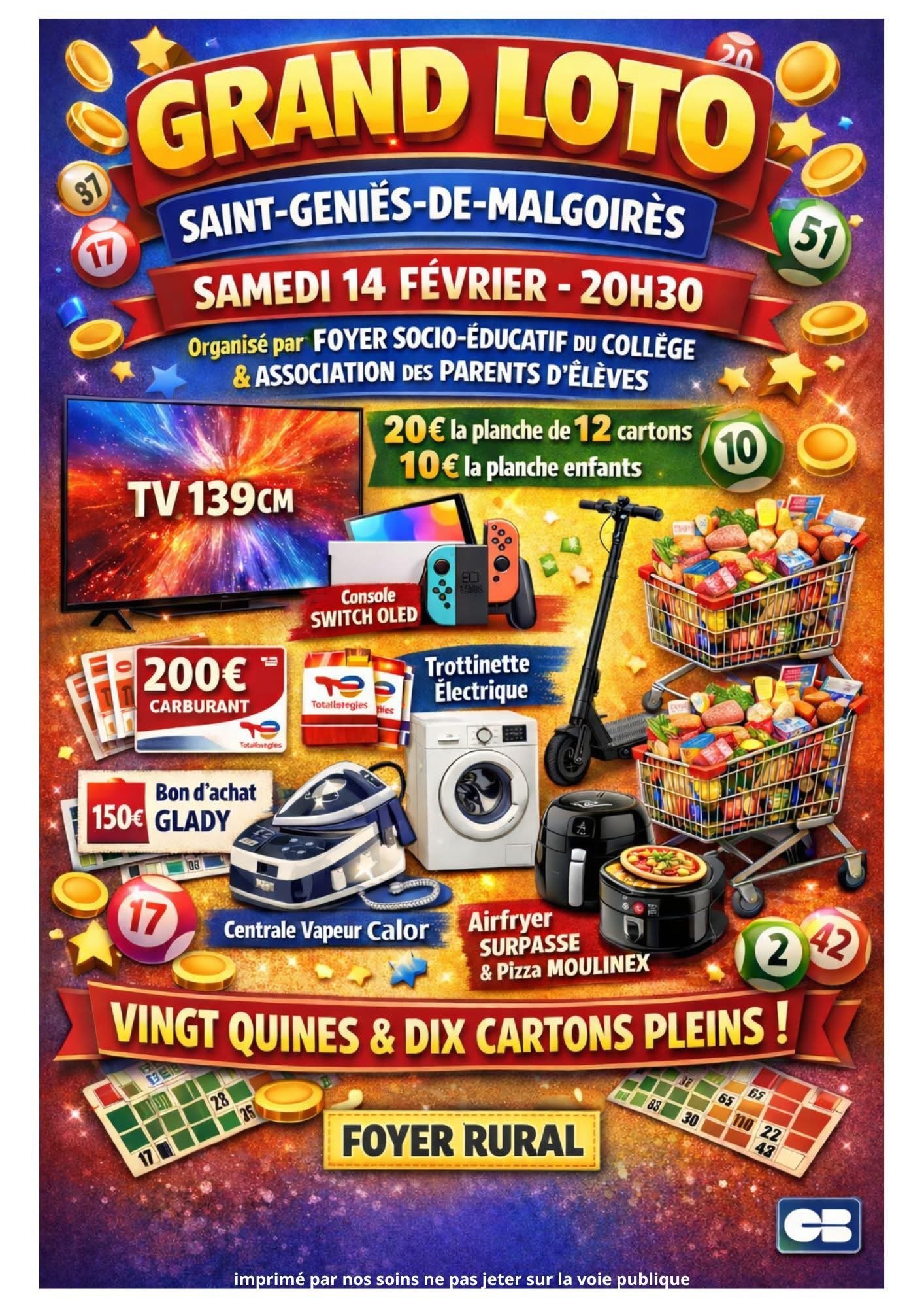 Dimanche 08 Février 2026 14h00 : Ouverture des portes 🎉 15h00 : Début du Super Loto 🐾 20 Quines à gagner 🎟️ 3 Cartons pleins 🏆 2 Cartons vides 📦 De nombreux lots : petit électroménager, bien-être, gastronomie, sorties, bons pour l'essence, cartes multi-enseignes 🎁 Plus de 1500 € de bons d'achats 💶 Cartes cadeaux de 400 €, 200 €, 100 € 💳 Buvette et petite restauration disponibles 🍽️ Tombola sur place 🎟️