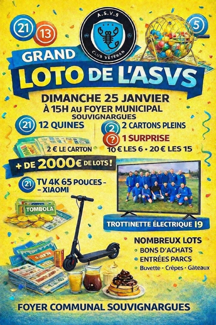 Dimanche 25 Janvier 2026 15h00 : 🎉 Début du Grand Loto de l'ASVS 12 Quines 🎱 2 Cartons Pleins 🗳️ 1 Surprise 🎁 Plus de 2000€ de lots 💰 TV 4K 65 pouces - Xiaomi 📺 Trottinette électrique 🛴 Nombreux lots : Bons d'achats, Entrées parcs 🎟️ Buvette, Crêpes, Gâteaux 🍽️