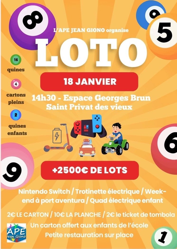 Dimanche 18 Janvier 2026 14h30 : Début du Loto 🎉 16 quines à gagner 🐂 4 cartons pleins 🎵 2 quines enfants 🍽️ +2500€ de lots à remporter 🔥 Lots : Nintendo Switch, Trottinette électrique, Week-end à Port Aventura, Quad électrique enfant 2€ le carton, 10€ la planche, 2€ le ticket de tombola Un carton offert aux enfants de l'école Petite restauration sur place 🍽️