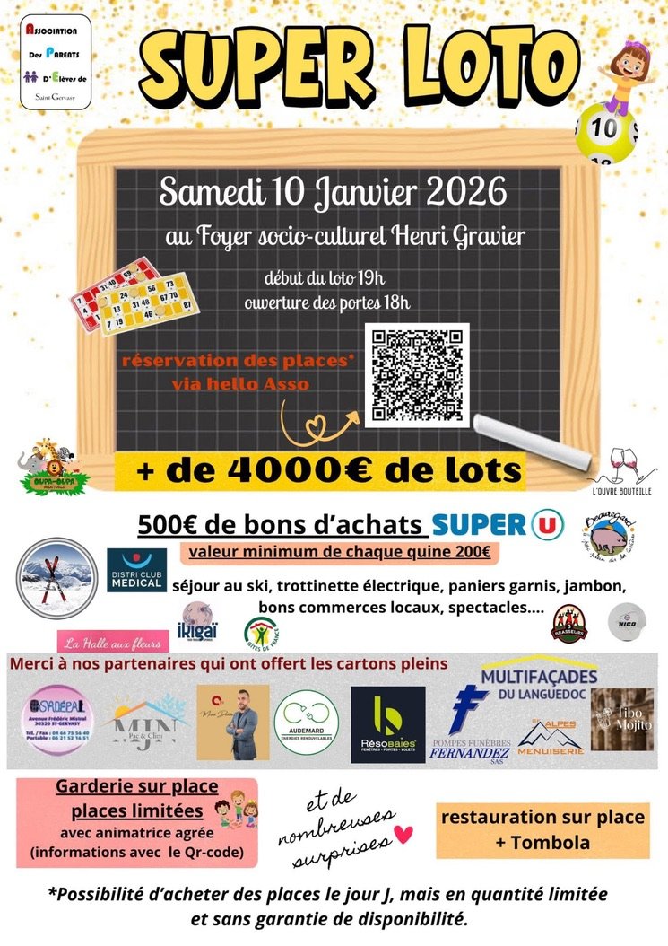 Dimanche 11 janvier 2026 🕐 13h30 : Ouverture des portes 🎉 14h30 : Début du Super Loto