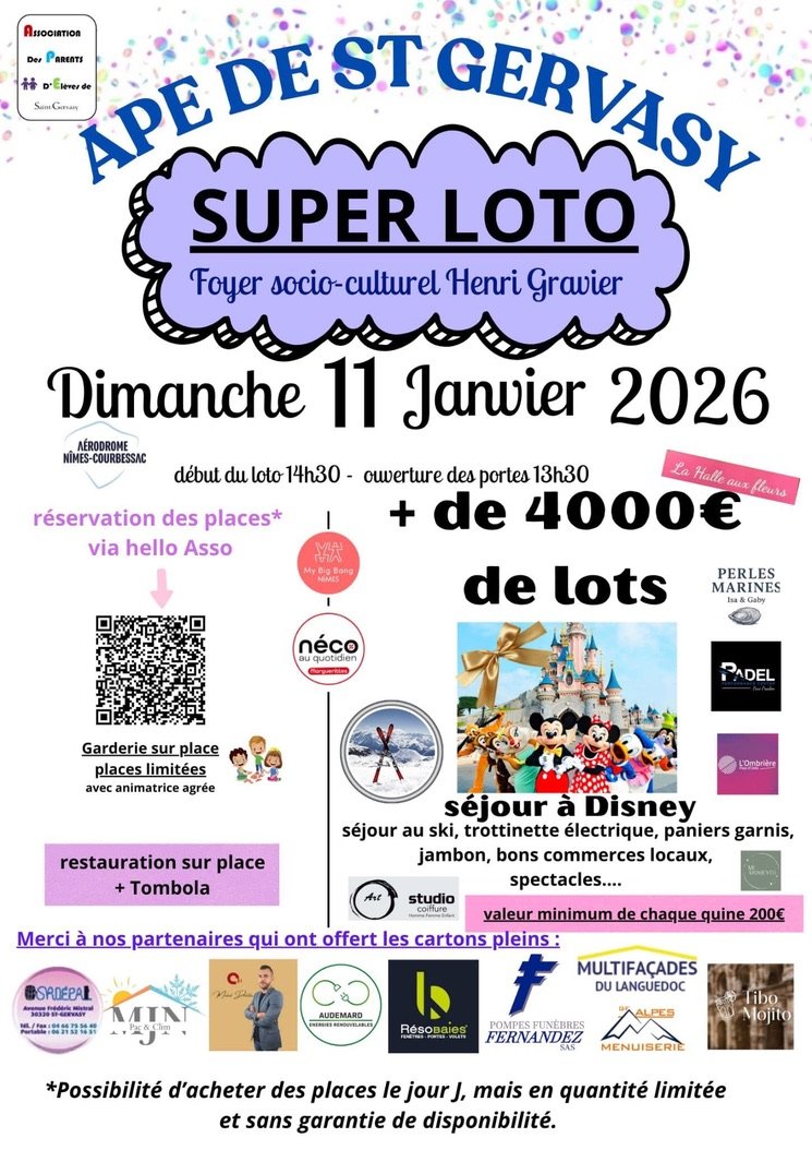 Dimanche 12 janvier 2025 14H30 : Loto salle Henry gravier Démonstration de danse à l'entracte par Annybody Ouverture des portes à 13h30 Places limitées 1 séjour à Disney 2 Week-ends au ski Baptême en ULM, Trottinette électrique , Air fryer, Séances photos, Bons d'achats , Entrées dans de nombreux parcs, Bons restaurants, Paniers garnis, Petits électroménagers, Soins esthétiques, Coiffeurs, Jouets, Pizzas ….