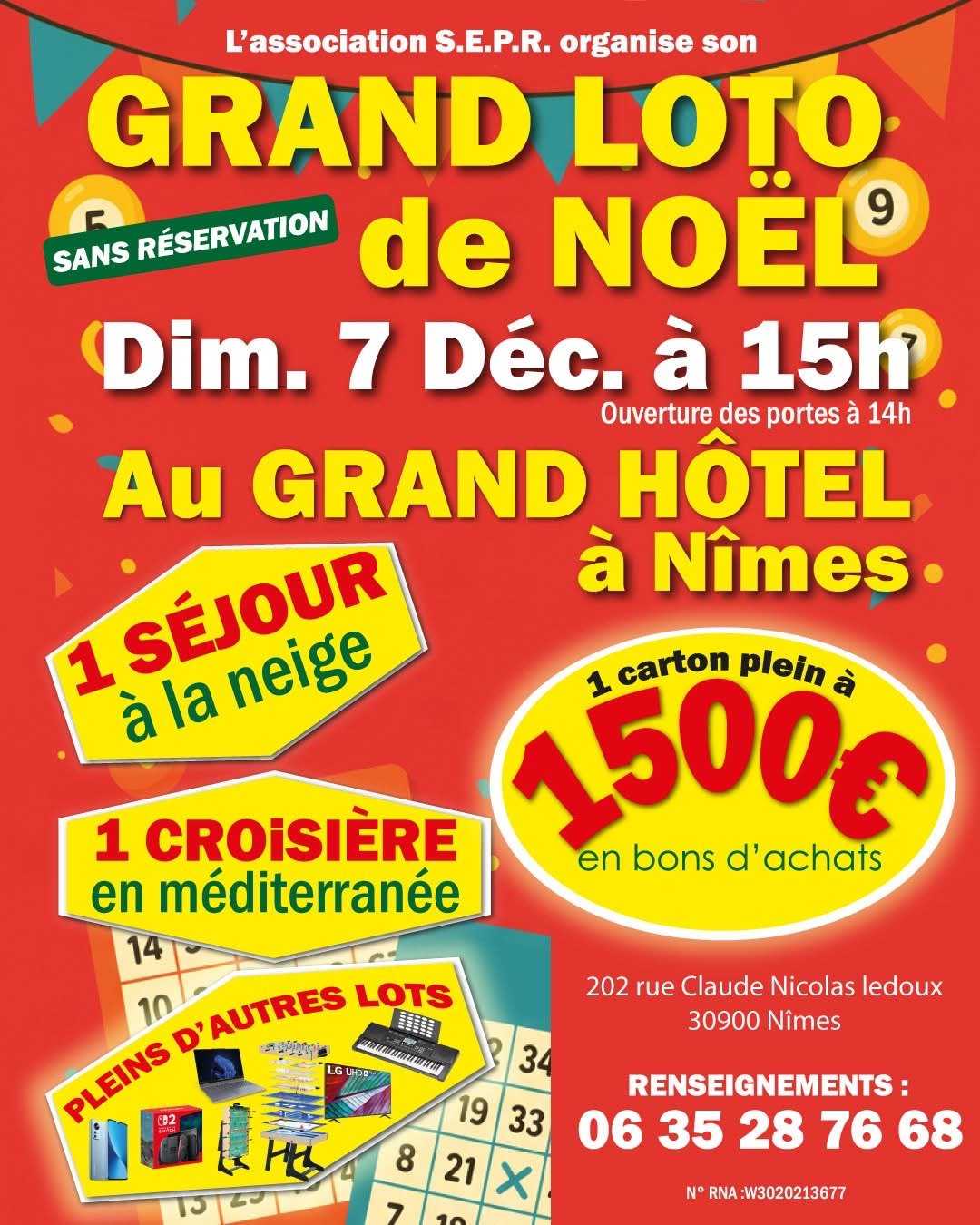 Dimanche 7 décembre 14h00 : Ouverture des portes 🎉 15h00 : Début du Grand Loto de Noël 🎄 Partie 1 : Filet garni 🍽️, Karaoké 🎤, Table multijeux 🎲 Partie 2 : Jambon cru 🍖, Tablette tactile 📱, Ordinateur portable 💻 Partie 3 : Montre connectée ⌚, Smartphone XIAOMI 📱, Corbeille de Noël Réveillon 🎁 Partie 4 : Centrale vapeur 🔥, Air fryer 🍳, Switch 2 🎮 Partie 5 : Stage de Pilotage (Subaru) 🚗, Piano électronique 🎹, TV 127cm 📺 Partie 6 : Jambon cru 🍖, Robot pâtissier 🍰, Séjour à la neige ❄️ Partie 7 : Drône 🚁, Jeu de fléchettes électronique 🎯, Croisière en Méditerranée 🚢