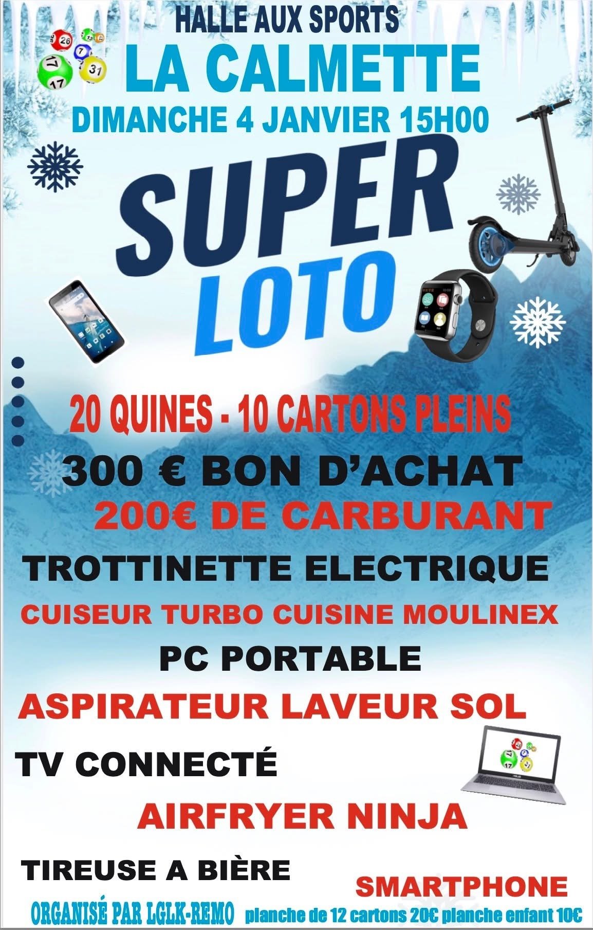Dimanche 4 janvier 15h00 : 🎉 Début du Super Loto 20 Quines et 10 Cartons Pleins à gagner 🎟️ 300 € Bon d'achat 💶 200 € de carburant ⛽ Trottinette électrique 🛴 Cuiseur Turbo Cuisine Moulinex 🍽️ PC Portable 💻 Aspirateur Laveur Sol 🧹 TV Connectée 📺 Airfryer Ninja 🍟 Tireuse à bière 🍺 Smartphone 📱