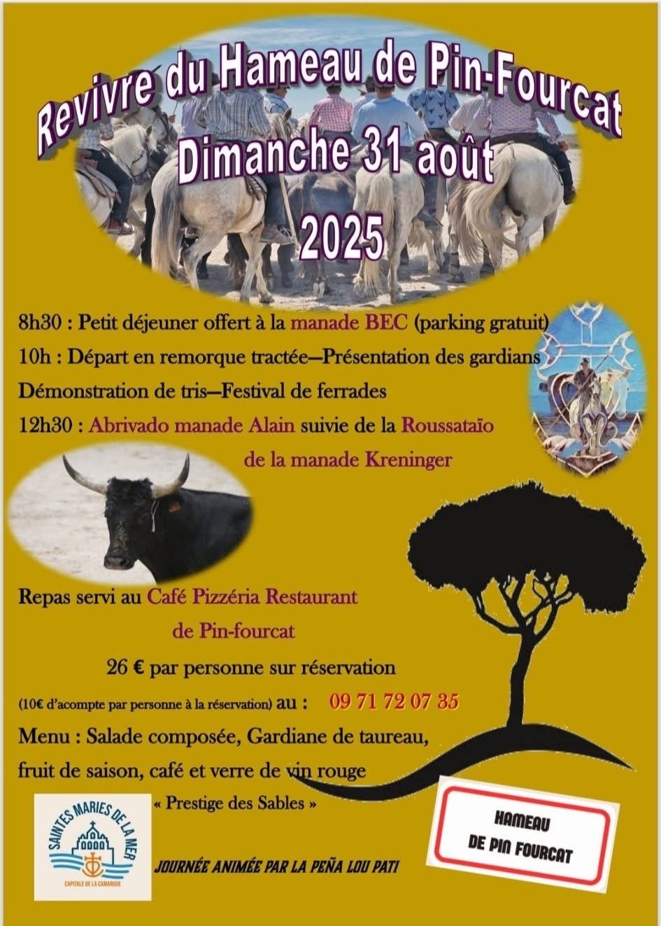 Dimanche 31 août 8h30 : Petit déjeuner offert à la manade BEC (parking gratuit) ☕🐂 10h : Départ en remorque tractée—Présentation des gardians, démonstration de tris—Festival de ferrades 🚜🎉 12h30 : Abrivado manade Alain suivie de la Roussataio de la manade Kreninger 🐴🔥 Repas servi au Café Pizzéria Restaurant de Pin-fourcat 🍽️. 26 € par personne sur réservation.