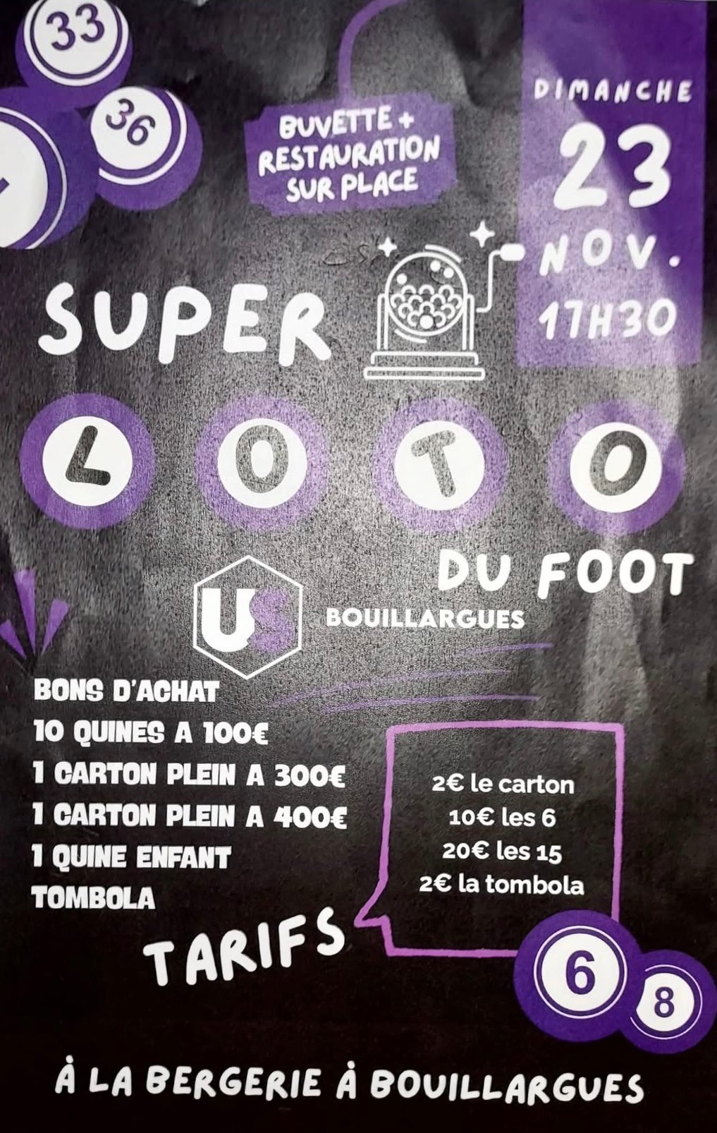 Dimanche 23 novembre 2025 17h30 : 🎱 Début du Super Loto du Foot 🍽️ Buvette et restauration sur place 🎟️ Tombola 10 quines à 100€ 1 carton plein à 300€ 1 carton plein à 400€ 1 quine enfant Tarifs : 2€ le carton / 10€ les 6 / 20€ les 15 / 2€ la tombola