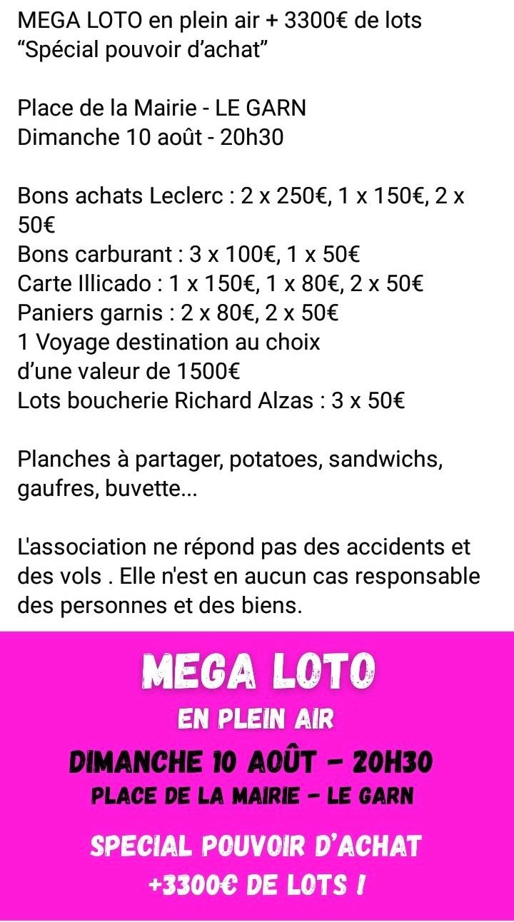 Dimanche 10 août 20h30 🎉 Début du Mega Loto en plein air 🎁 Bons achats Leclerc : 2 x 250€, 1 x 150€, 2 x 50€ ⛽ Bons carburant : 3 x 100€, 1 x 50€ 🎫 Carte Illicado : 1 x 150€, 1 x 80€, 2 x 50€ 🍽️ Paniers garnis : 2 x 80€, 2 x 50€ ✈️ 1 Voyage destination au choix d'une valeur de 1500€ 🍖 Lots boucherie Richard Alzas : 3 x 50€ 🔥 Planches à partager, potatoes, sandwiches, gaufres, buvette...