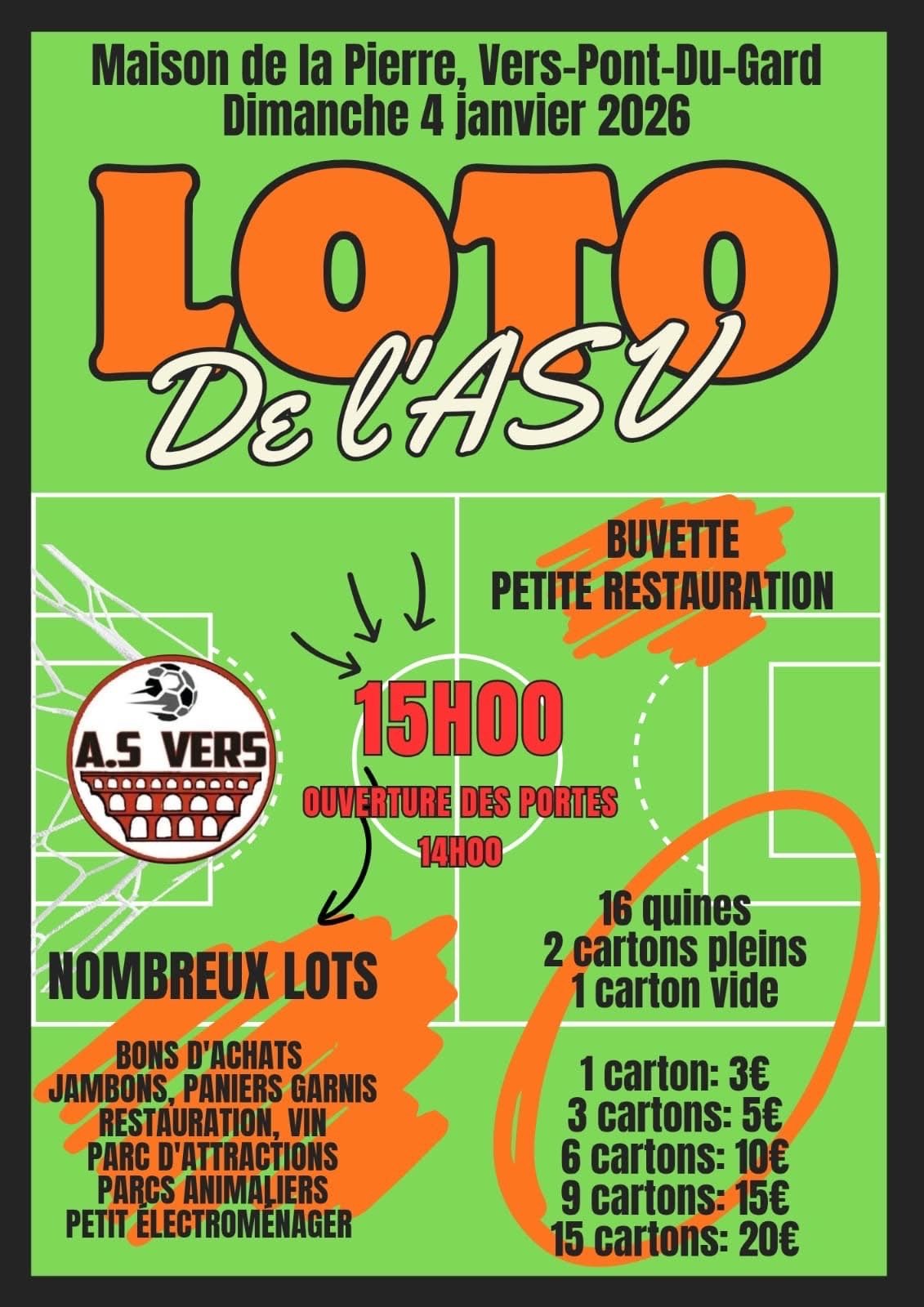 Dimanche 4 janvier 2026 14h00 : Ouverture des portes 🚪 15h00 : Début du Loto 🎉 Profitez de nombreux lots à gagner, tels que des bons d'achats, des jambons, des paniers garnis, et bien plus encore ! 🍽️🎁 Buvette et petite restauration disponibles sur place. 🍹🍔