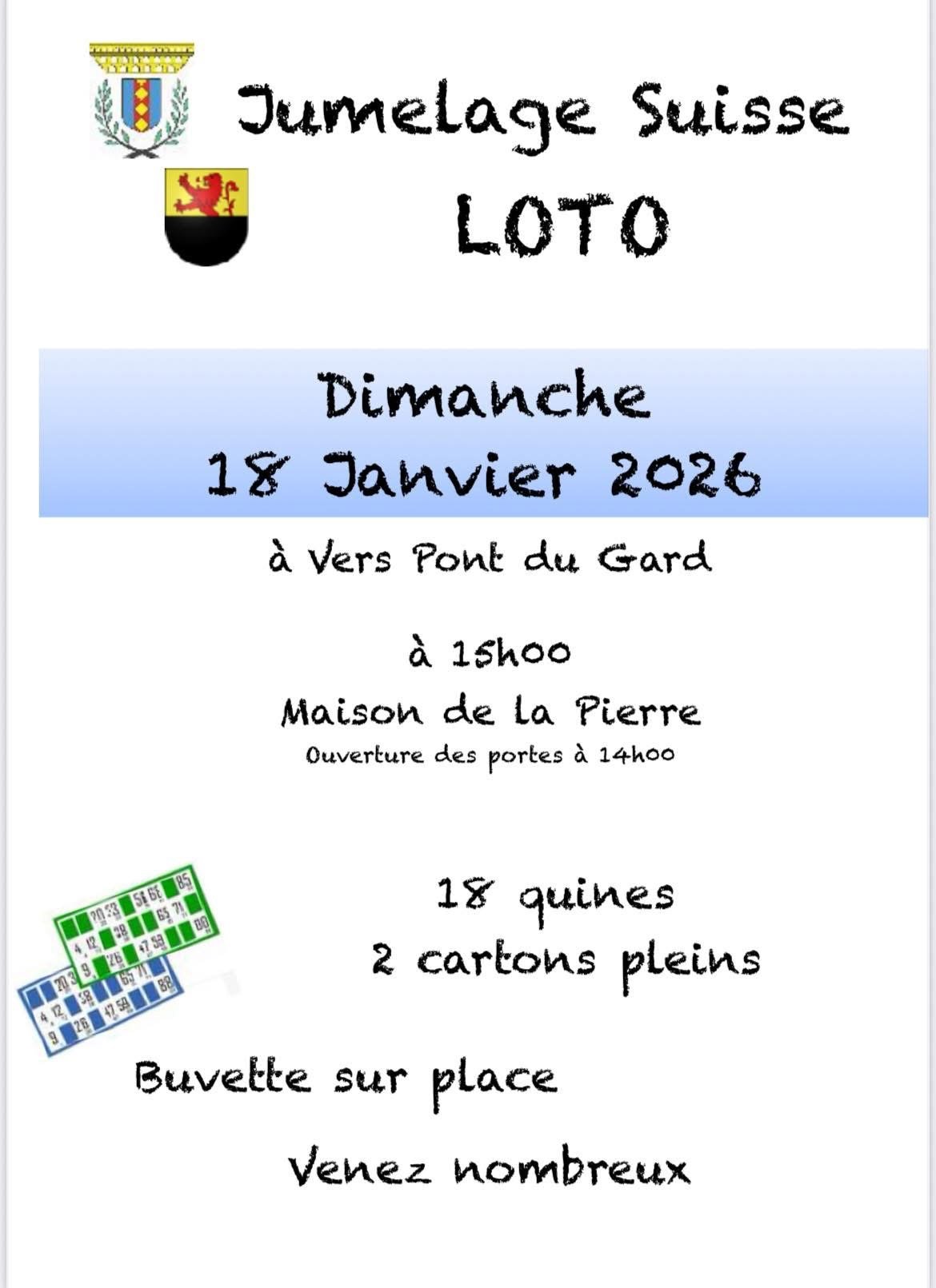Dimanche 18 Janvier 2026 🕒 14h00 : Ouverture des portes 🎉 15h00 : Début du Loto 🎱 18 quines 🃏 2 cartons pleins 🍽️ Buvette sur place 🔥 Venez nombreux