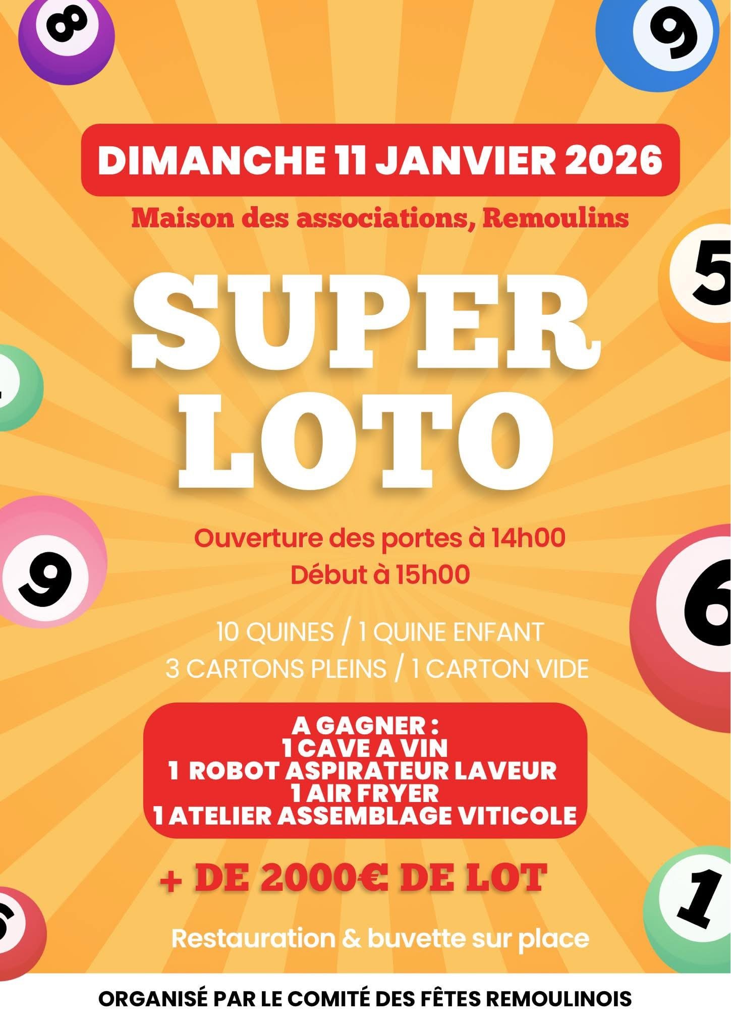 Dimanche 8 Février 2026 🕑 14h00 : Ouverture des portes 🎉 15h00 : Début du Loto avec de nombreux lots à gagner, tels que Airfryer, appareil à raclette, cafetière 🎟️ 2€ le carton, 10€ les 6 🏆 Lots spéciaux : 2 entrées pour Disney, Nintendo Switch 2