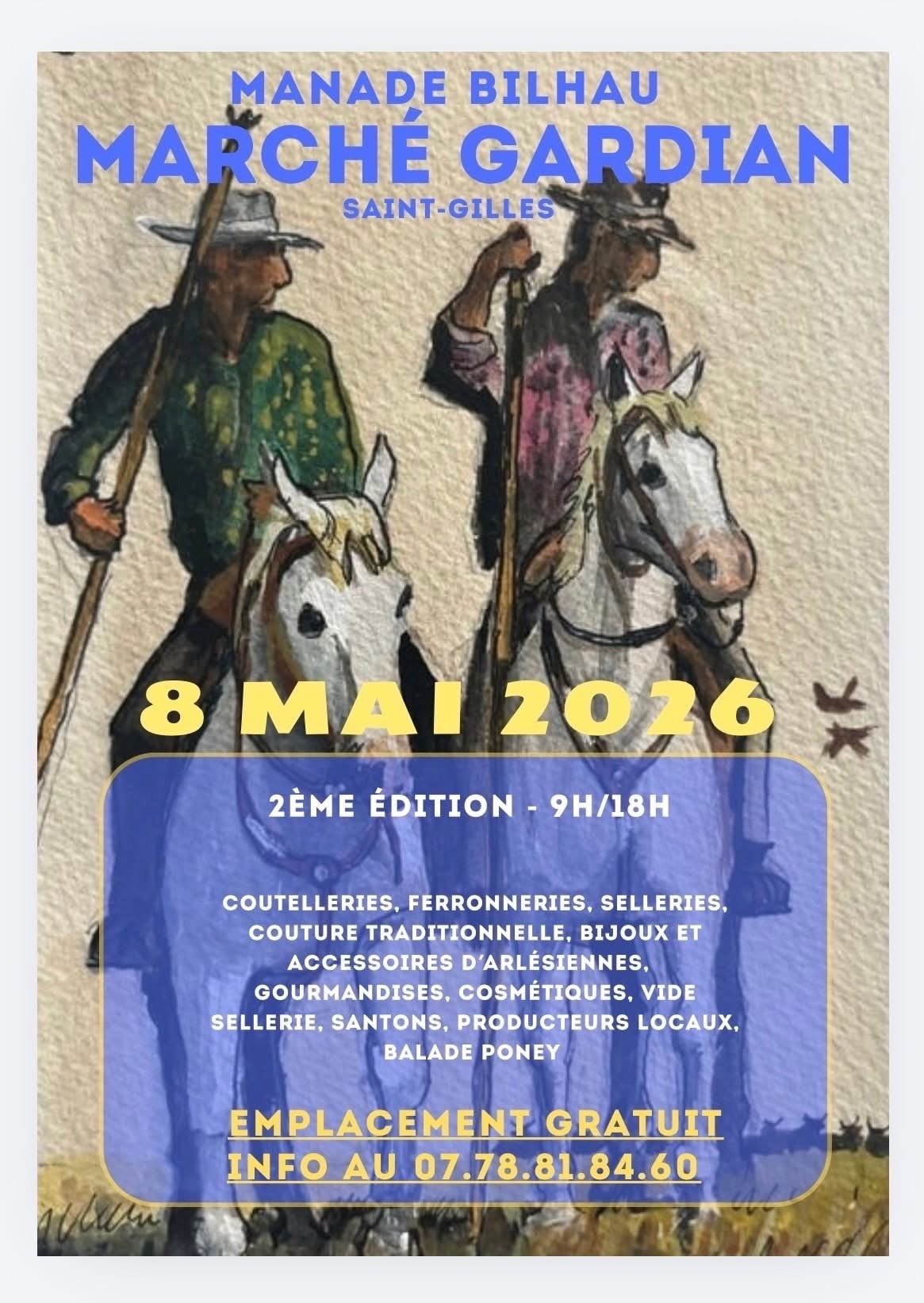 Vendredi 8 Mai 2026 09:00 - Ouverture du marché 🎉 10:00 - Coutelleries et ferronneries artisanales 🔪 11:00 - Selleries et couture traditionnelle 👗 12:00 - Bijoux et accessoires d'Arlésiennes 💍 13:00 - Dégustation de gourmandises locales 🍽️ 14:00 - Cosmétiques naturels 💄 15:00 - Vide sellerie 🐴 16:00 - Exposition de santons 🎨 17:00 - Rencontre avec les producteurs locaux 🥕 18:00 - Balade en poney pour les enfants 🐎