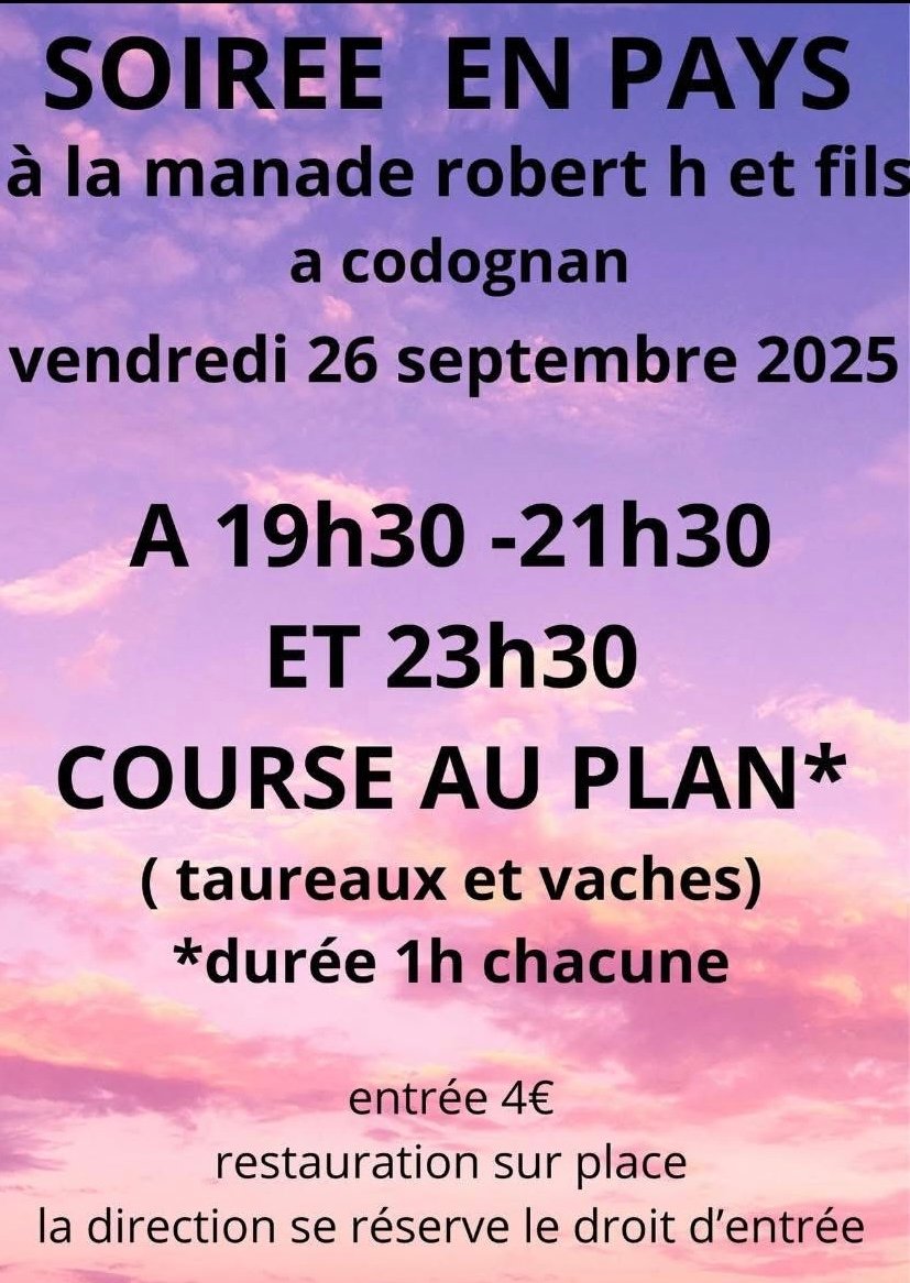 Profitez du spectacle grandiose de la Journée taurine à Codognan, dans le Gard. Cette fête votive offre aux visiteurs une occasion unique d'admirer la tradition taurine dans toute sa splendeur. Assistez à des corridas passionnantes et vivez des moments intenses empreints de bravoure et d'émotions fortes. Ne manquez pas le programme détaillé de cet événement exceptionnel, disponible sur cette page. De plus, saviez-vous que la Route royale, commandée par Louis XIV lui-même, traverse le sud du village de Codognan ? Cette anecdote historique ajoute une touche supplémentaire de grandeur à cette journée inoubliable. Samedi 2 novembre Lot Tombola : Jambon Crue + Devise De L'Asso 1ére Journée Manade Robert H - Manade Gillet 10H30 : Concours D'Abrivados/Bandidos 12H : Mini Course Au Plan (2 Taureaux) 12H30 : Apéro Des Copains Ambiance Calienté Bodega By DJ Stan Et Le Groupe Gynsies Compas 14H : Concours De Course Au Plan (8 Taureaux) 17H : Remise Des Prix Vous pouvez consulter le programme de la fête votive de 2023 et celui de la fête de 2024.