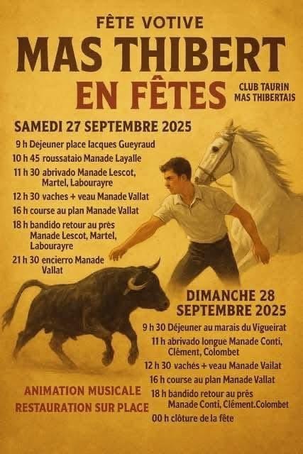 Samedi 27 septembre 2025 9 h : Déjeuner place Jacques Gueyraud 🍽️ 10 h 45 : Roussataïo Manade Layalle 🐎 11 h 30 : Abrivado Manade Lescot, Martel, Labourayre 🐂 12 h 30 : Vaches + veau Manade Vallat 🐄 16 h : Course au plan Manade Vallat 🔥 18 h : Bandido retour par les prés Manade Lescot, Martel, Labourayre 🐂 21 h 30 : Encierro Manade Vallat 🌙 Dimanche 28 septembre 2025 9 h 30 : Déjeuner au marais du Vigueirat 🍽️ 11 h : Abrivado longue Manade Conti, Clément, Colombet 🐂 15 h 30 : Vaches + veau Manade Vallat 🐄 16 h : Course au plan Manade Vallat 🔥 18 h : Bandido retour Manade Conti, Clément, Colombet 🐂 20 h : Clôture de la fête 🎉