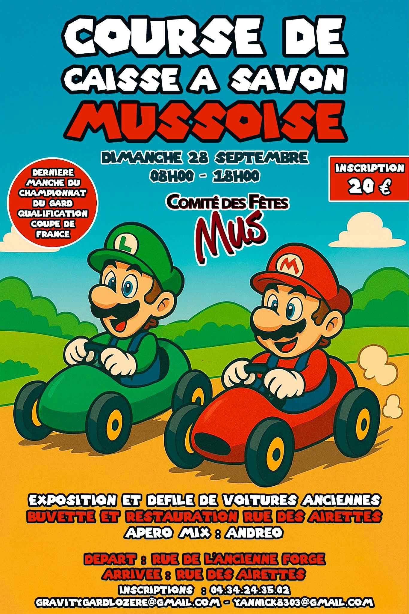 Passionné de sport mécanique, nous vous invitons à vous rendre à la Course de caisse à savon à Mus, dans le Gard, pour profiter d'un spectacle divertissant et vous amuser. Cet évènement promet d'être une expérience inoubliable pour les amateurs de sensations fortes. Vous pourrez admirer les participants se lancer dans des descentes palpitantes à bord de leurs caisses à savon artistiquement conçues. Pour connaître le programme détaillé de cette manifestation, veuillez consulter la page dédiée à cet événement. Par ailleurs, il est intéressant de noter que des vestiges de thermes ont été découverts à proximité du village de Mus, ajoutant une touche historique à cette région pittoresque. Ne manquez pas l'opportunité de participer à cette course et de découvrir ces vestiges fascinants lors de votre visite à Mus. Samedi 16 novembre 8h contrôle technique pour tous les véhicules qui souhaitent courir ou plutôt rouler 10h première descente, essai 11h première descente, chronométré Apéritif musical avec sa célèbre saucisse au vin blanc / frites 15h deuxième descente, chronométrée 16h troisième descente, chronométrée Une fois le matin et une fois l’après-midi des voitures de collection défileront sur le parcours, celle-ci seront exposées durant toute la journée.Le départ s’effectuera :Rue de l’ancienne forge Et […]
