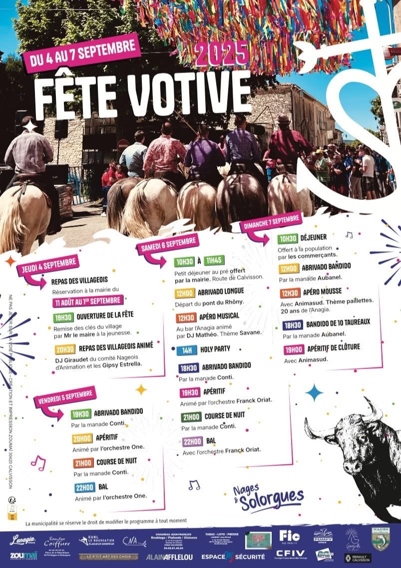 Jeudi 4 septembre 🕡 19h30 : Ouverture de la Fête 🎉 🕗 20h30 : Repas des Villageois animé 🍽️ Vendredi 5 septembre 🕢 19h30 : Abrivado Bandido 🐂 🕗 20h00 : Apéritif 🍹 🕘 21h00 : Course de Nuit 🌙 🕙 22h00 : Bal 🎵 Samedi 6 septembre 🕥 10h30 à 11h45 : Petit déjeuner 🍽️ 🕛 12h00 : Abrivado Longue 🐂 🕧 12h30 : Apéro Musical 🎵 🕓 16h30 : Holy Party 🔥 🕡 18h30 : Abrivado Bandido 🐂 🕢 19h30 : Apéritif 🍹 🕘 21h00 : Course de Nuit 🌙 🕙 22h00 : Bal 🎵 Dimanche 7 septembre 🕥 10h30 : Déjeuner offert 🍽️ 🕛 12h00 : Abrivado Bandido 🐂 🕧 12h30 : Apéro Mousse 🎉 🕡 18h30 : Bandido de 10 taureaux 🐂 🕖 19h00 : Apéritif de Clôture 🍹