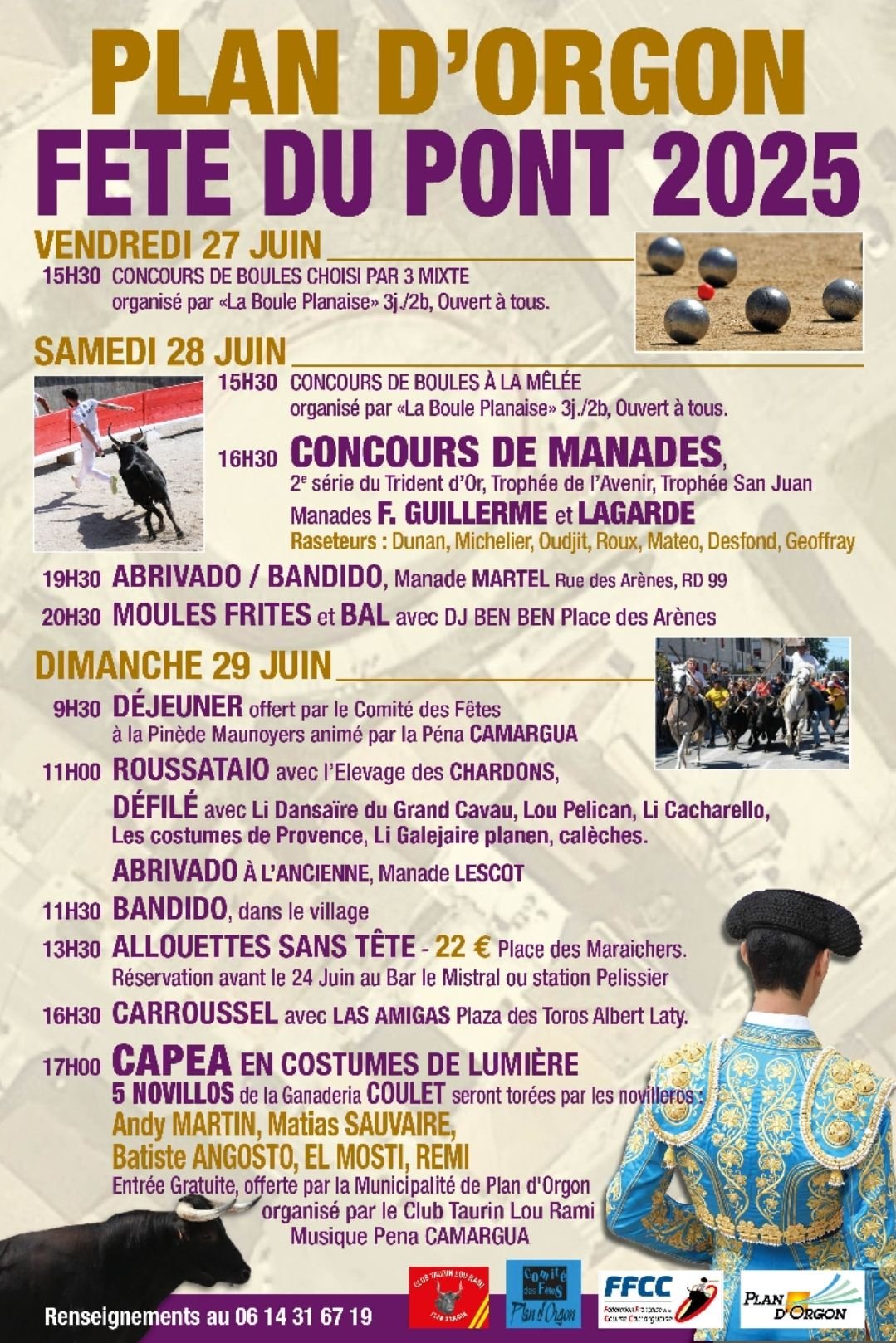 Ville d'Orgon , FranceMercredi 13 août 9h30 - Concours de boules pour les jeunes et les anciens - Place du Four à Chaux 🎳 21h - Jeux de gardians - Manade Grimaud - 5€ - Gratuit pour les moins de 8 ans - Arènes 🐂 Jeudi 14 août 10h - Jeux à l'ancienne - Place de la Liberté 🎲 15h30 - Concours de boules - Mêlée - Place du Four à Chaux 🎳 20h - Repas Camarguais - 16€ - Place du Four à Chaux 🍽️ 21h - Soirée dansante par l'orchestre Solaris - Place du Four à Chaux 🎵 Vendredi 15 août 9h - Concours de pêche - Canal Gamet 🎣 9h - Concours de boules - Tête à tête - Petit déjeuner offert - Place du Four à Chaux 🍳 10h - Messe - Église paroissiale ⛪ De 10h à 15h - Course de caisses à savon - Centre du village 🏎️ 15h30 - Concours de boules - Mêlée - Place du Four à Chaux 🎳 20h - Moules Frites - 16€ - Place du Four à Chaux 🍟 21h - Soirée dansante par l'orchestre LSP - Place du Four à Chaux 🎵 Samedi 16 août 9h - Déjeuner avec la […]