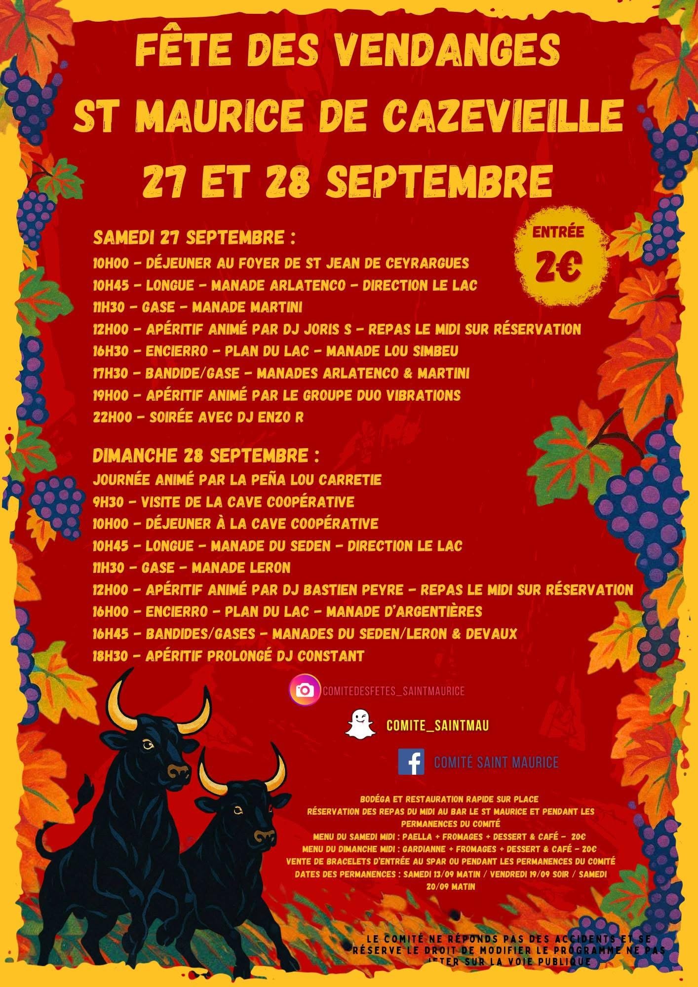 Samedi 27 septembre 2025 10h00 - Déjeuner au foyer de St Jean de Ceyrargues 🍽️ 10h45 - Longue - Manade Arlatenço - Direction le lac 🐂 11h30 - Gase - Manade Martini 🎉 12h00 - Apéritif animé par DJ Joris S - Repas le midi sur réservation 🍷🎵 16h30 - Encierro - Plan du lac - Manade Lou Simbeu 🔥 17h30 - Bandide/Gase - Manades Arlatenço & Martini 🐂 19h00 - Apéritif animé par le groupe Duo Vibrations 🍹🎵 22h00 - Soirée avec DJ Enzo R 🎵 Dimanche 28 septembre 2025 Journée animée par la Peña Lou Carretie 🎶 9h30 - Visite de la cave coopérative 🍷 10h00 - Déjeuner à la cave coopérative 🍽️ 10h45 - Longue - Manade du Seden - Direction le lac 🐂 11h30 - Gase - Manade Leron 🎉 12h00 - Apéritif animé par DJ Bastien Peyre - Repas le midi sur réservation 🍷🎵 16h00 - Encierro - Plan du lac - Manade d'Argentière 🔥 16h45 - Bandides/Gases - Manades du Seden/Leron & Devaux 🐂🔥 18h30 - Apéritif prolongé DJ Constant 🍹🎵