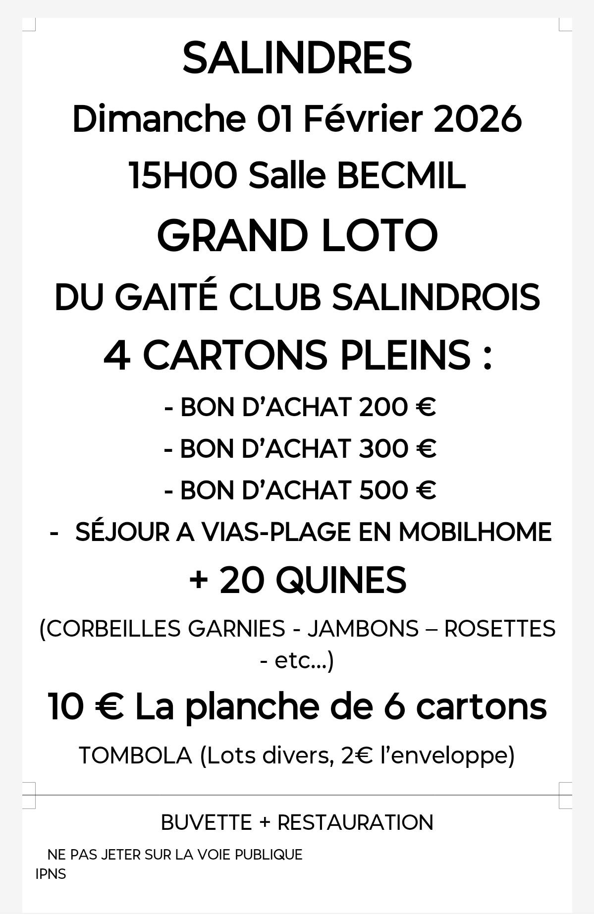 Dimanche 01 Février 2026 15h00 🎉 Grand Loto du Gaîté Club Salindrois 4 Cartons Pleins 🐂 Bon d'achat 200 € Bon d'achat 300 € Bon d'achat 500 € Séjour à Vias-Plage en mobilhome + 20 Quines 🎵 Corbeilles garnies Jambons Rosettes 10 € La planche de 6 cartons 🍽️ Tombola (Lots divers, 2€ l'enveloppe) 🔥 Buvette + Restauration disponibles