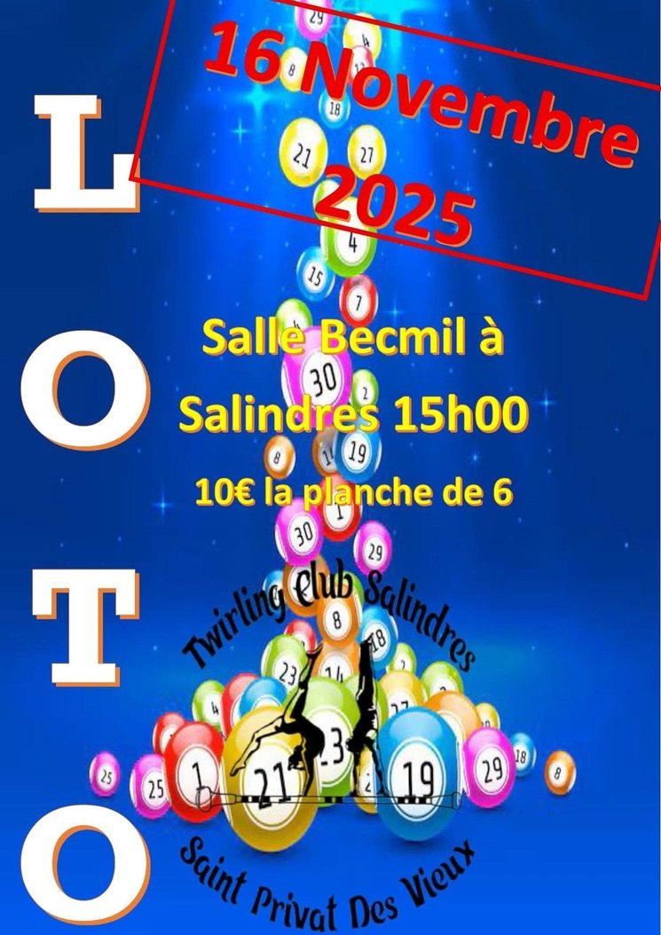 Dimanche 24 Novembre 2024 15H00 : LOTO Salle Becmil - Salindres -24 quines - 1 carton vide - 4 cartons pleins(valeur 300€par carton) -1200€ de bons d'achat -paniers garnis, jambons, bons divers(resto , sports ..), paniers de charcuterie , alcool ... 10€ LES 6 CARTONS - TOMBOLA BUVETTE, GATEAUX, FRIANDISES, CHIPS