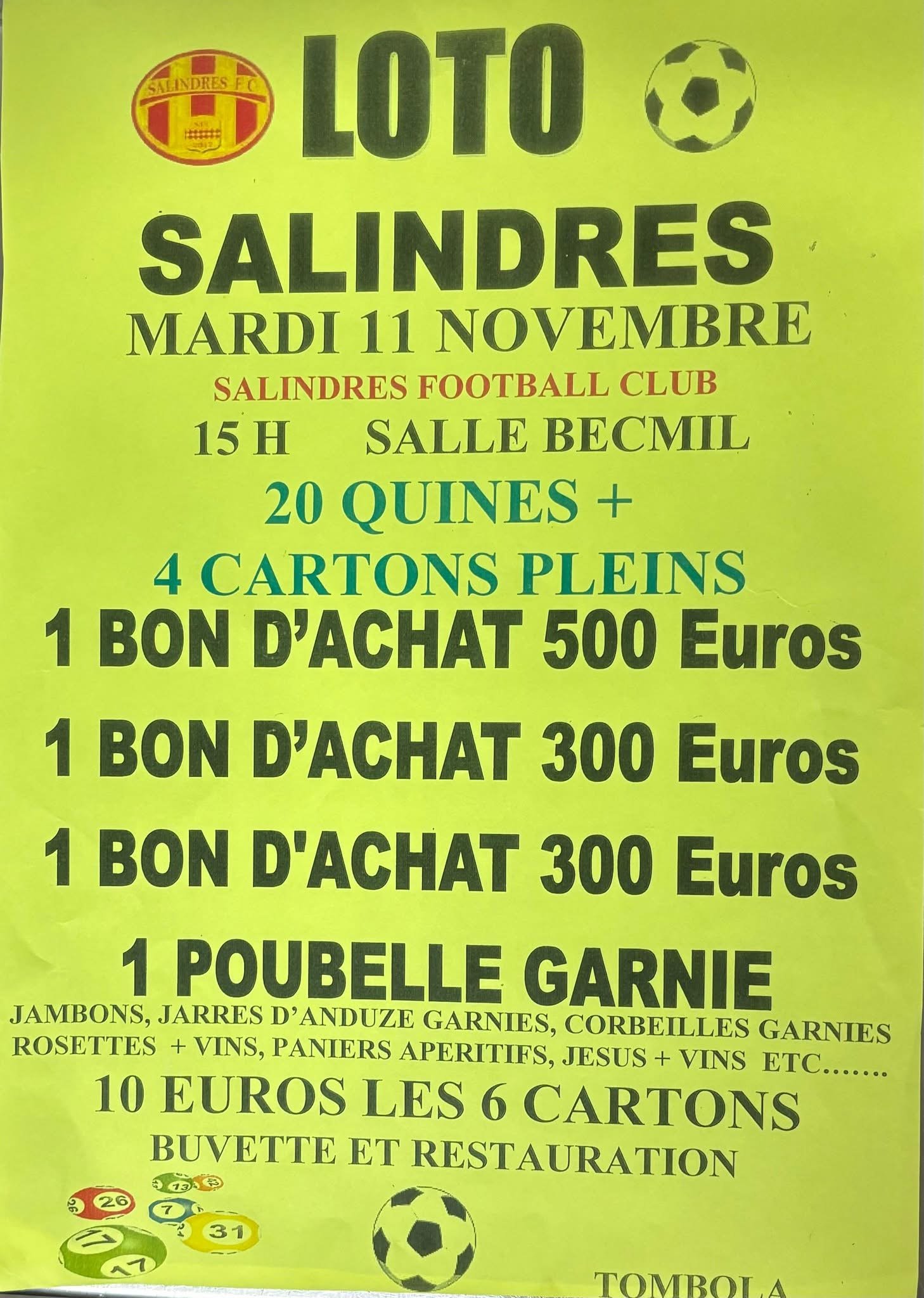 Lundi 11 novembre 15H LOTO : SALINDRES FOOTBALL CLUB SALLE BECMIL 20 QUINES + 4 CARTONS PLEINS 1 BON D'ACHAT 500 Euros 1 BON D'ACHAT 300 Euros 1 BON D'ACHAT 200 Euros 1 POUBELLE GARNIE JAMBONS, JARRES D’ANDUZE GARNIES, CORBEILLES GARNIES ROSETTES + VINS, PANIERS APERITIFS, JESUS + VINS-ETC.,..….. 10 EUROS LES 6 CARTONS BUVETTE ET RESTAURATION