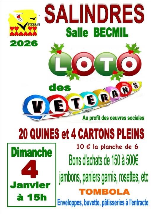 Dimanche 4 janvier 15h00 : Loto des Vétérans 🎉 20 Quines et 4 Cartons Pleins 🐂 Bons d'achats de 150 à 500€ 💶 Jambons, paniers garnis, rosettes, etc. 🍽️ Tombola 🎟️ Enveloppes, buvette, pâtisseries à l'entracte 🍰