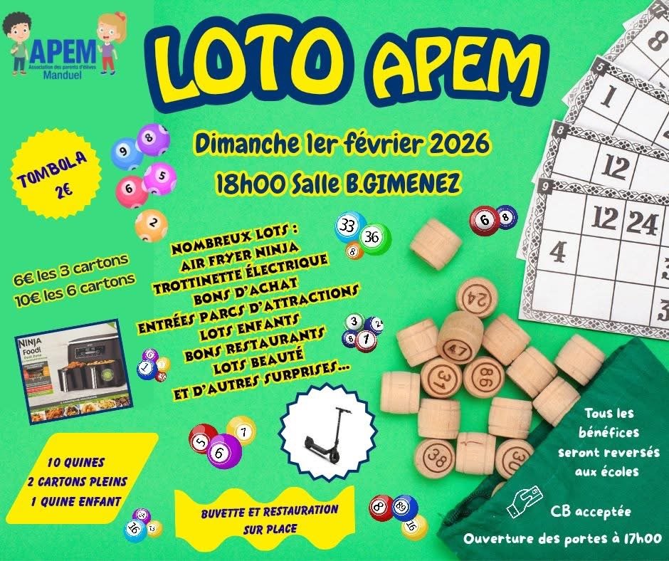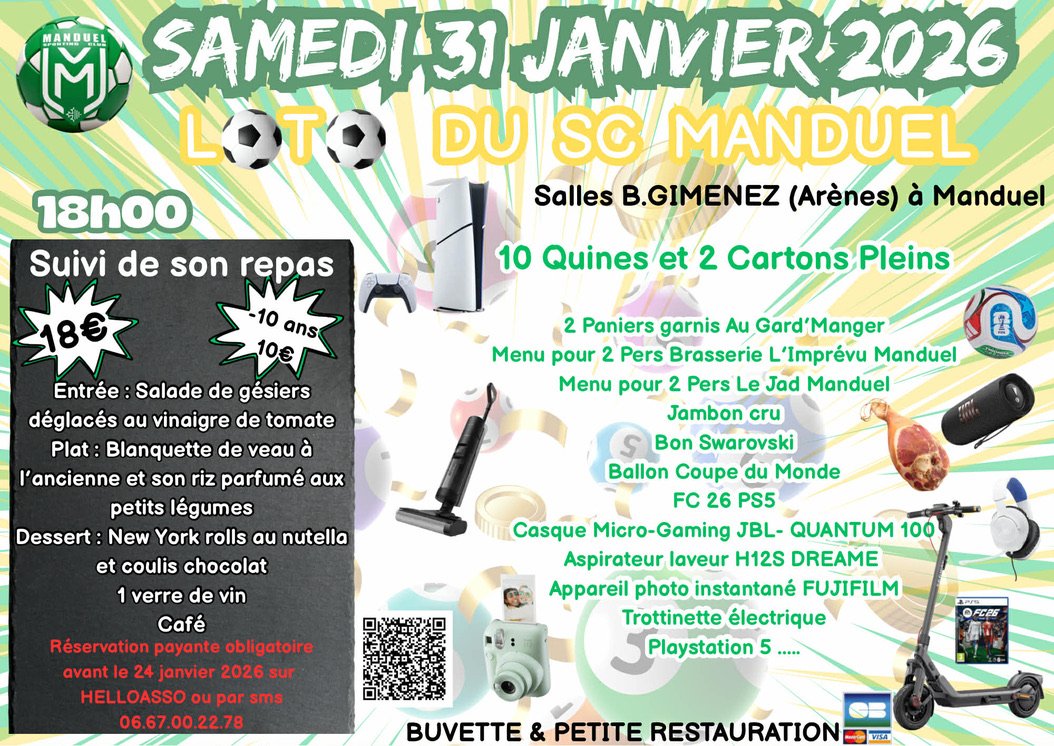 Samedi 31 janvier 2026 18h00 🎉 - Début du Loto du SC Manduel Suivi de son repas 🍽️ - Entrée : Salade de gésiers déglacés au vinaigre de tomate Plat : Blanquette de veau à l'ancienne et son riz parfumé aux petits légumes Dessert : New York rolls au nutella et coulis chocolat 1 verre de vin et café inclus 10 Quines et 2 Cartons Pleins 🎟️ 2 Paniers garnis Au Gard'Manger Menu pour 2 Pers Brasserie L'Imprévu Manduel Menu pour 2 Pers Le Jad Manduel Jambon cru Bon Swarovski Ballon Coupe du Monde FC 26 PS5 Casque Micro-Gaming JBL- QUANTUM 100 Aspirateur laveur H12S DREAME Appareil photo instantané FUJIFILM Trottinette électrique Playstation 5 🎮