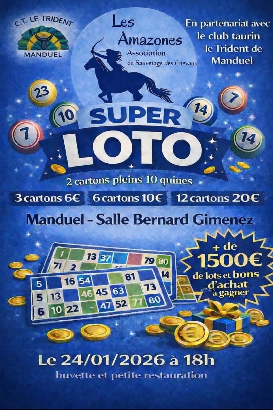 Samedi 24 Janvier 2026 18h00 : Début du Super Loto 🎉 Jeux de loto avec 2 cartons pleins et 10 quines 🐂 Plus de 1500€ de lots et bons d'achat à gagner 🎁 Buvette et petite restauration disponibles 🍽️