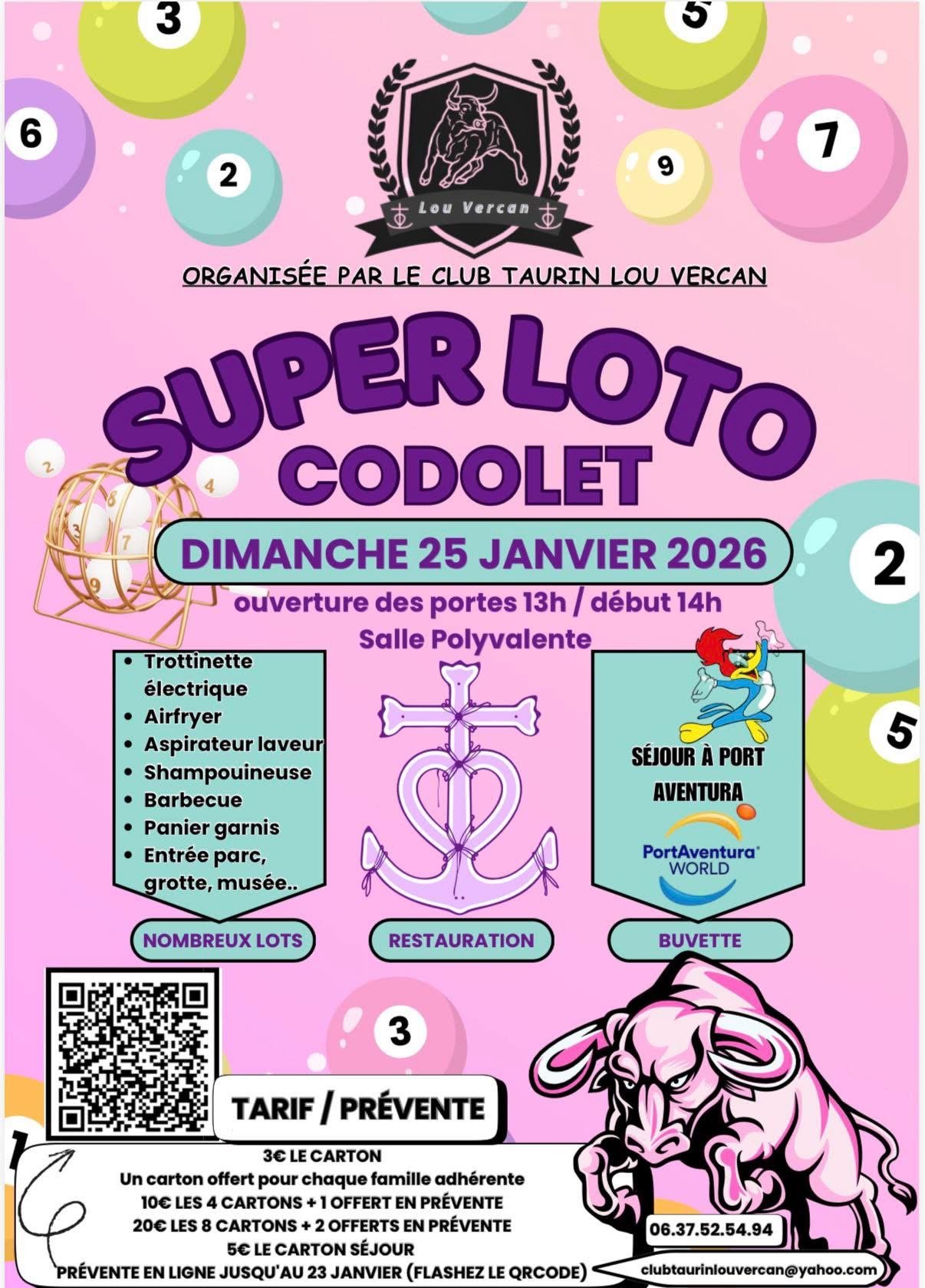 Dimanche 25 Janvier 2026 13h00 : Ouverture des portes 🎉 14h00 : Début du Super Loto 🐂