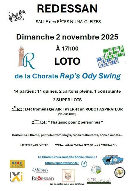 Loto à Redessan le 9 février à 17h Ouverture des portes à 16h15 3 cartons pleins Bissell Crosswave 3en1 + 1 trio de vin Four Multifonctions + 1 trio de vin Réfrigérateur Radiola + 1 blé de vin 10 quines + 1 consolante AirFryer Philips - Jambon + vin - Lot famille + restau - lot apéro + coffret - lot bien-être - coffret dégustation de vin - Lot cuisine + grille pain - 2 corbeilles garnies + box dinatoire - lot chandeleur + crêpière - radio retro, usb, bluetooth + BA sur toutes les quines : alimentation, beauté, multi-enseignes, loisirs, restauration, habillement, primeur Buvette + snacks Soft, bières, eau, café, crêpes, pizzas, chips Tombola (2€ le Num / 5€ les 3) Lot 1 2 menus 'Nacool' + 3 entrées Séquarium + jeu, peluche + coffret Doudou Lot 2 1 vin "Mas des Pins" + coffret tire bouchon + carafe à décanter Lot 3 bon 25€ "Restaurant 423" + lot lingettes écolo + 1 sacoche "Jules" Lot 4 BA 20€ multi-enseignes + 1 peluche éléphant Lot 5 Mixeur multi-fonctions 3 en 1 + BA 10€ proxi + consolante : lot surprise