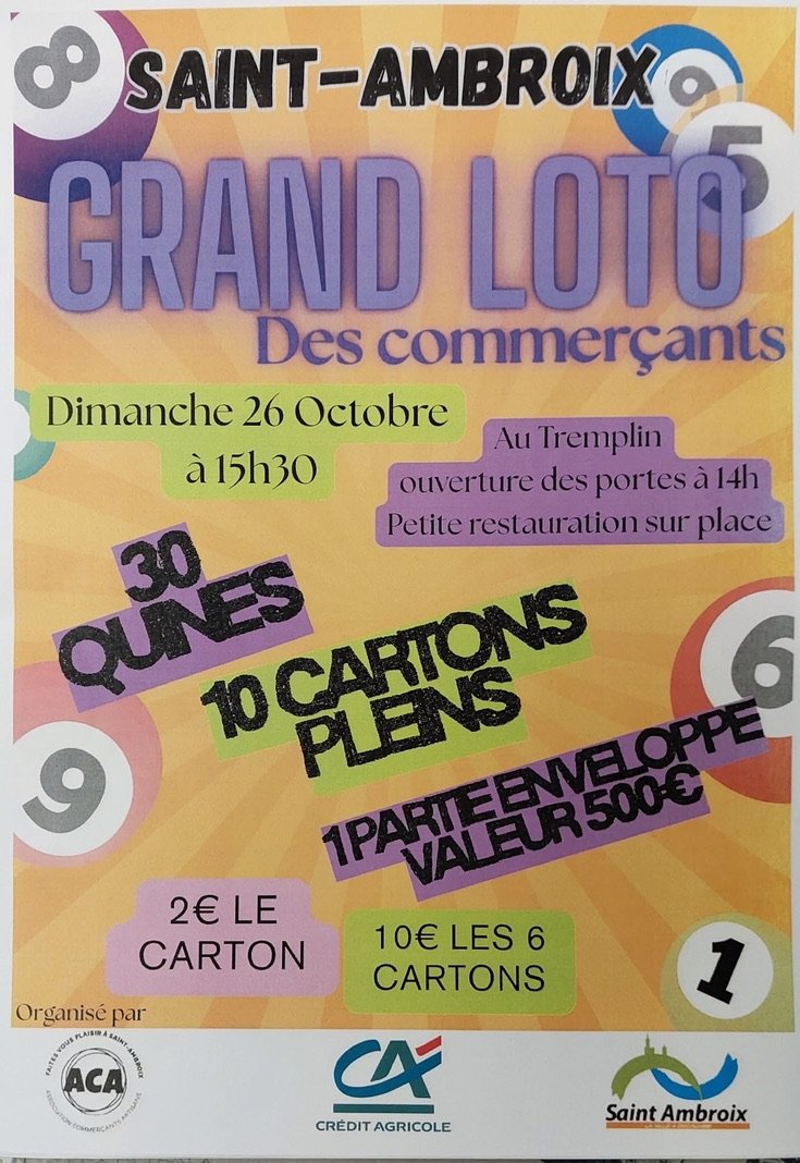 Salle du tremplin - Saint Ambroix Rue de l'Esplanade, Saint-Ambroix, Occitanie, FranceDimanche 26 octobre 14h00 : Ouverture des portes 🔑 15h30 : Début du Grand Loto 🎉 🗒️ 30 Quines à gagner 🎟️ 10 Cartons pleins 🎁 1 Partie en enveloppe (Valeur 500€) 🍽️ Petite restauration sur place