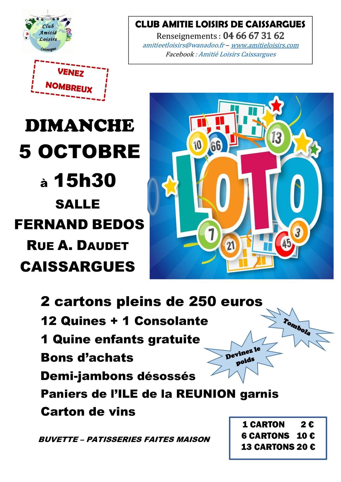 Loto à Caissargues le dimanche 16 février à 15h 2 cartons pleins de 250€ 12 quines + 1 consolante 1 quine enfants gratuite Bons d'achats Demi-jambons désossés Carton de vins Tombola Buvette - Pâtisserie faites maison 1 carton 2€ 6 cartons 10€ 13 cartons 20€ Renseignements: 04 66 67 31 62