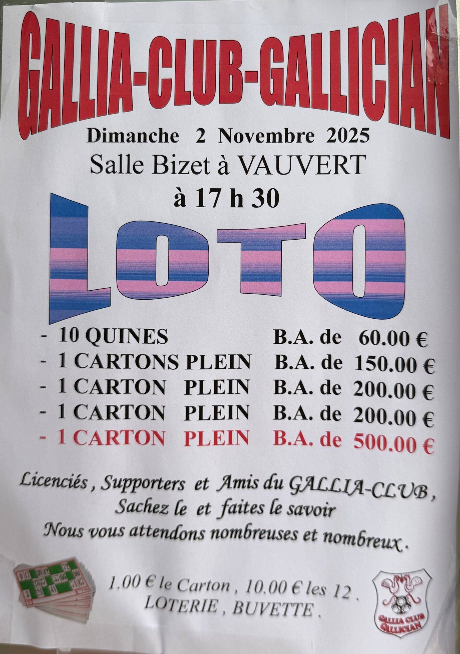 Dimanche 2 novembre 2025 17h30 : Loto 🎉 10 Quines - B.A. de 60,00 € 💶 1 Carton Plein - B.A. de 150,00 € 💶 1 Carton Plein - B.A. de 200,00 € 💶 1 Carton Plein - B.A. de 200,00 € 💶 1 Carton Plein - B.A. de 500,00 € 💶
