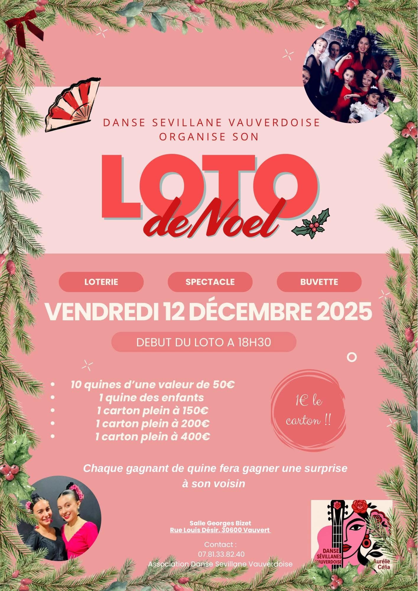 Samedi 17 Janvier 2026 17h30 : Début de la soirée loto 🎉 Nombreux lots à gagner 🎁 Restauration disponible 🍽️ Buvette ouverte 🍹 Tombola pour plus de chances de gagner 🎟️ 10 quines d'une valeur de 60€ chacune 💶 2 cartons pleins d'une valeur de 350€ et 200€ 💰 1 carton plein avec une TV 📺