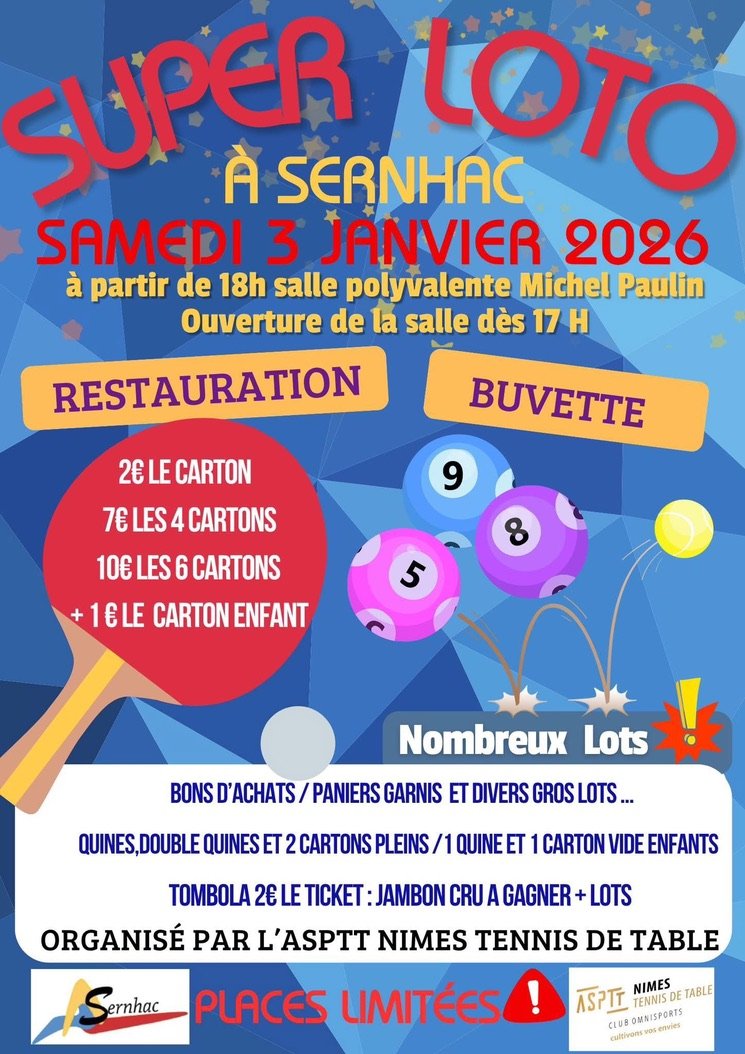 Téléthon 2024 à Sernhac Programme week end Téléthon le 30/11 et 01/12 sur SERNHAC Samedi 30/11 à partir de 9h - 17h salle Michel Paulin - 25 rue des Bourgades Sernhac 9h - 17h Kermesse des enfants fil rouge du week end "bati le pont du Gard en bouchons" -apporter bouchon ou capsules 10h Marché des exposants, petit déjeuner à 2 € exposition des créations des écoles maternelles , expo photo, expo dessins, maison en pâtisserie (début des votes) 11h30 : démonstration de danse buvette , restauration sur place (sandwichs + frites) - défis crêpes (battre 430 crêpes :) pop corn , vin chaud... 15h délibération des divers concours 18h apéros 20h soirée dansante avec DJ Melvin Rochet ouvert à tous restauration possible sur réservation Dimanche 01/12 à partir de 9h Marché couvert chemin de la Cave 9h- 16h Marché de Noel, passage du Père Noël, mascottes de Sernhac , jeux gonflables 9h 11h marche/ trail 10 km organisé par "SMS" 5€ par participants (petit déjeuner offert aux sportifs) balade de voitures et motos anciennes - "association les Tartuffes" buvette, restauration sur place (sandwichs +frites), 13h30-17h jeux de société pour enfant salle des associations - "association temps du jeux"