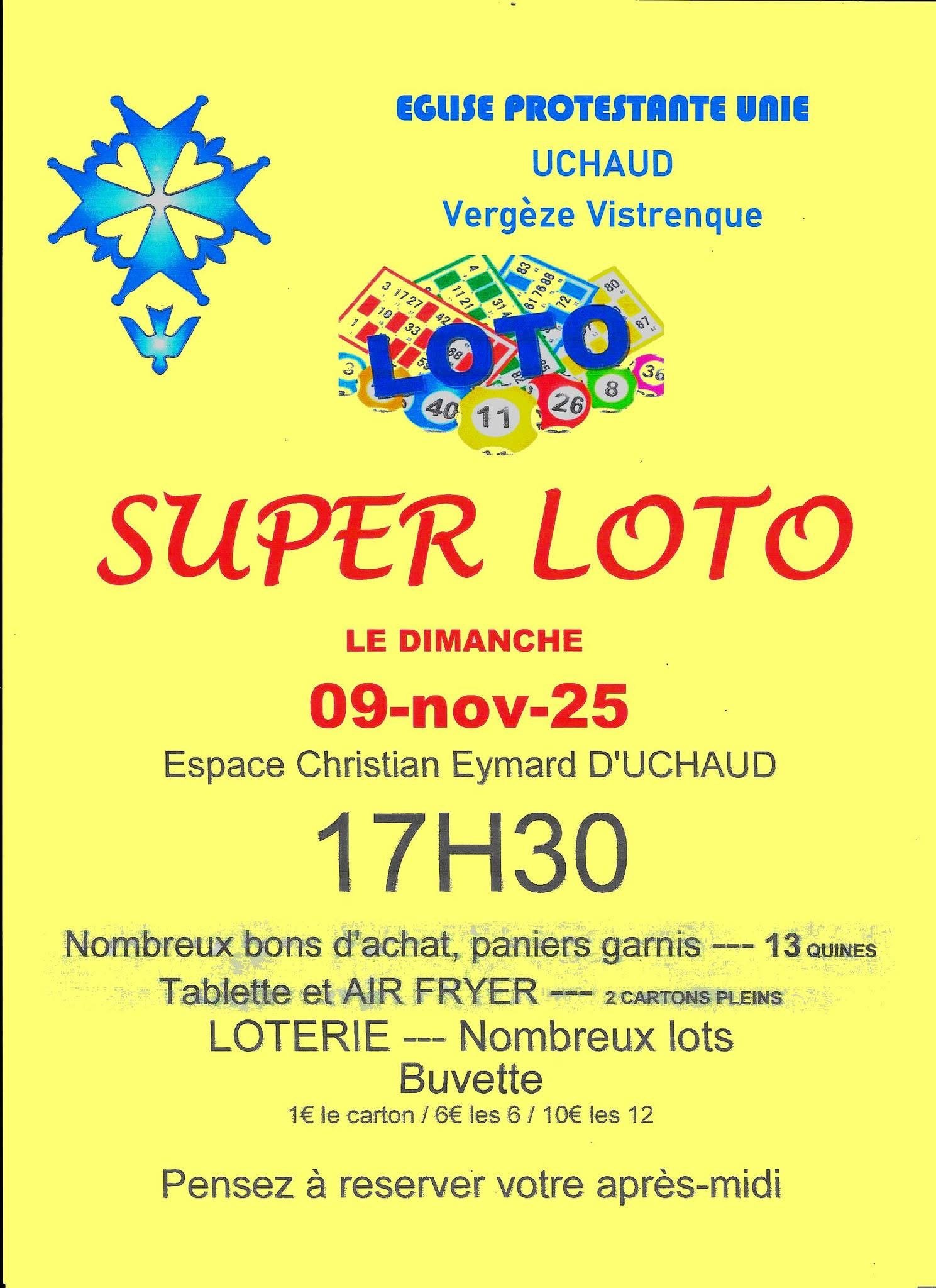 Dimanche 9 novembre 17h30 : 🎉 Super Loto avec de nombreux bons d'achat et paniers garnis 🎁 13 quines avec des lots comme une tablette et un air fryer 🎟️ Loterie avec de nombreux lots à gagner 🍽️ Buvette disponible