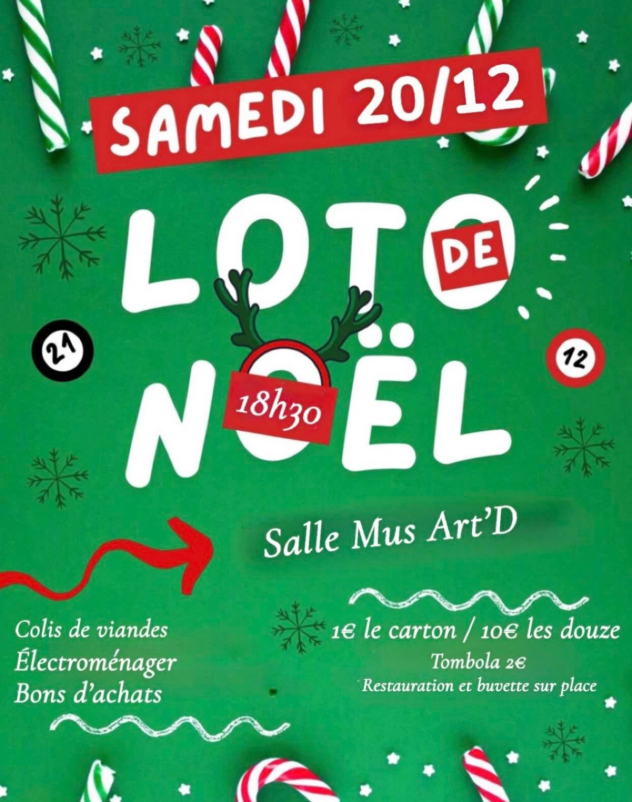 Samedi 20 décembre 18h30 : Début du Loto de Noël 🎉 Colis de viandes 🍖 Électroménager 🍽️ Bons d'achats 🎁 Tombola à 2€ 🎟️ Restauration et buvette sur place 🍽️🍹