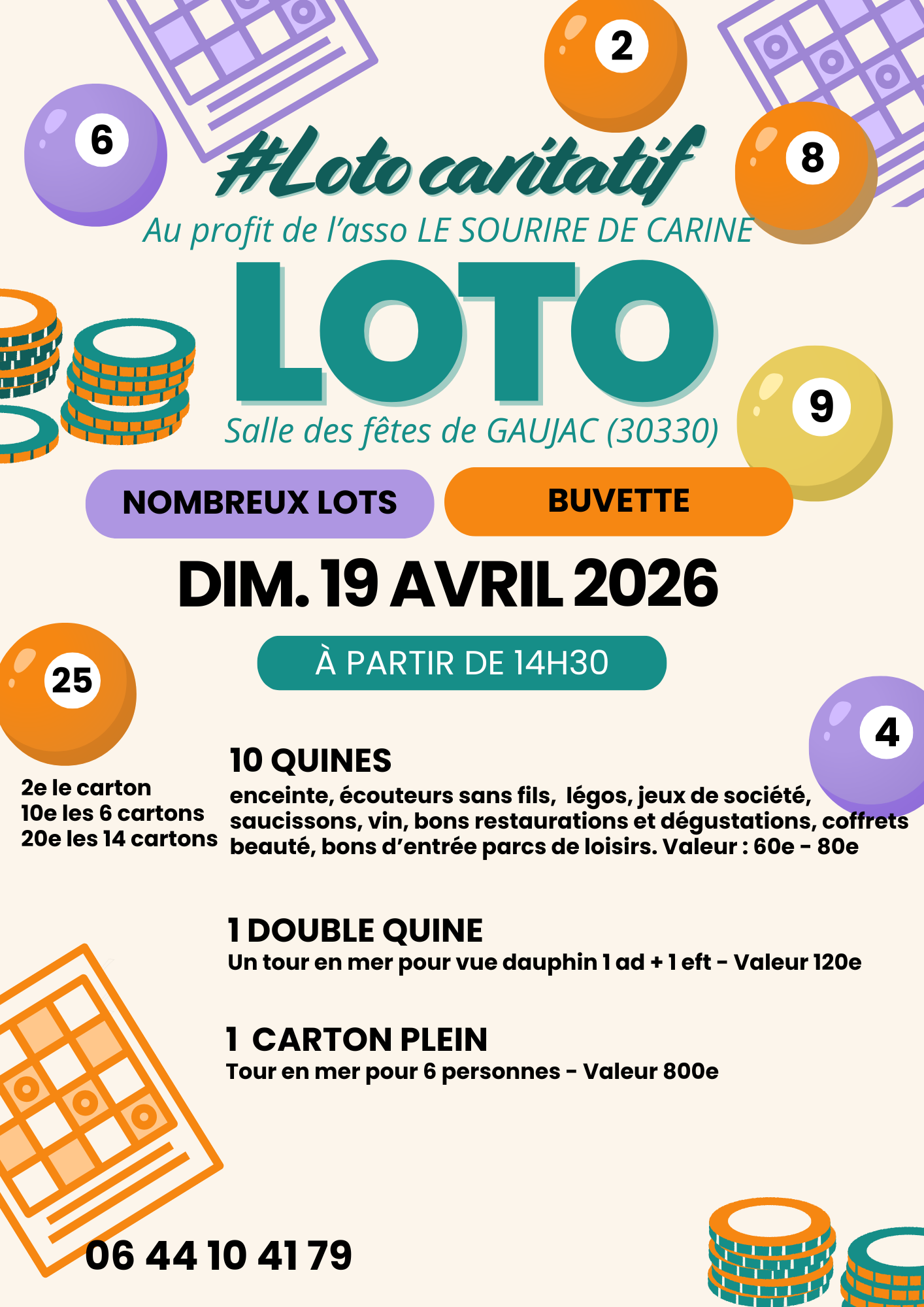 Dimanche 19 Avril 2026 🎉 14h30 : Début du Loto caritatif 🎵 10 Quines : Enceinte, écouteurs sans fils, légos, jeux de société, saucissons, vin, bons restauration et dégustations, coffrets beauté, bons d’entrée parcs de loisirs. Valeur : 60€ - 80€ 🐬 1 Double Quine : Un tour en mer pour vue dauphin 1 adulte + 1 enfant - Valeur 120€ 🌊 1 Carton Plein : Tour en mer pour 6 personnes - Valeur 800€ 2e le carton 10e les 6 cartons 20e les 14 cartons 13h30 : Ouverture des portes
