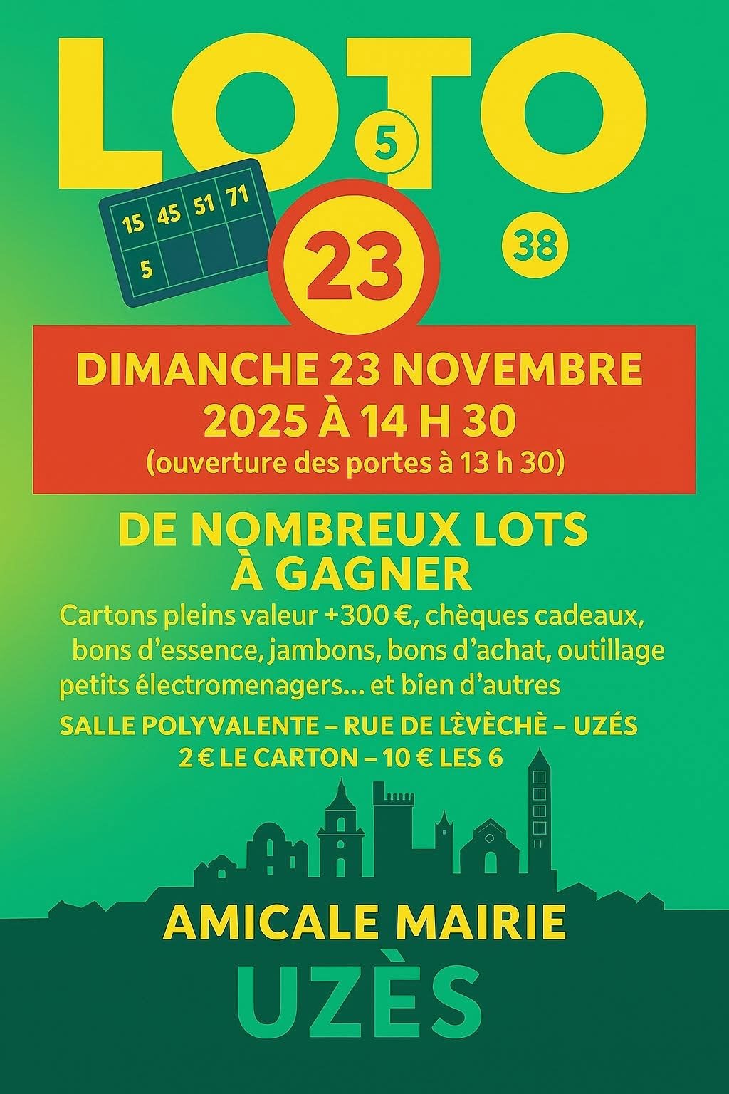 Salle polyvalente - Uzès Rue de l'Évêché, Uzès, Occitanie, FranceDimanche 23 novembre 13h30 : Ouverture des portes 🕰️ 14h30 : Début du Loto 🎉 De nombreux lots à gagner : Cartons pleins valeur +300 €, chèques cadeaux, bons d’essence, jambons, bons d’achat, outillage, petits électroménagers... et bien d’autres 🎁