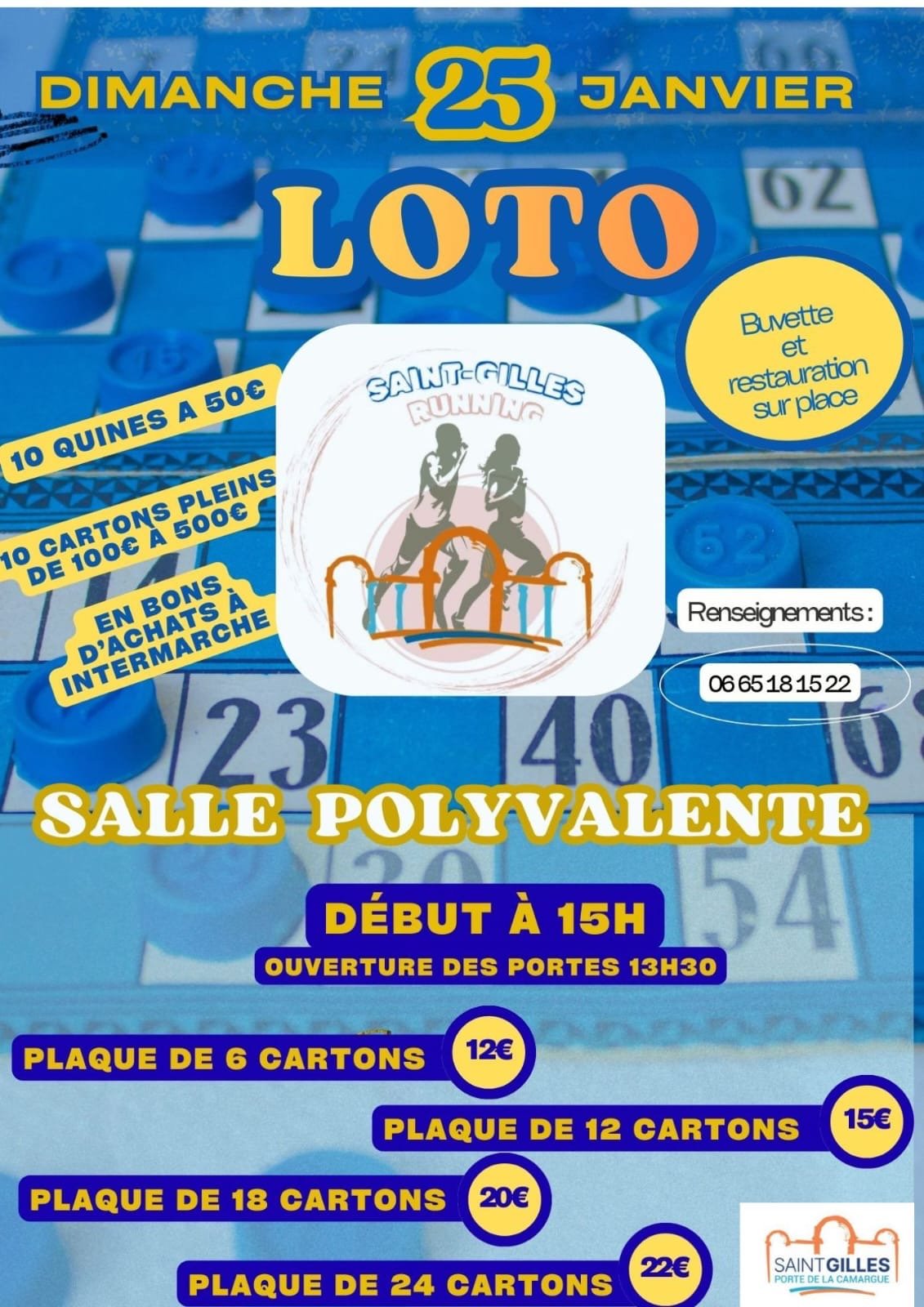 Dimanche 25 Janvier 2026 13h30 : Ouverture des portes 🕒 15h00 : Début du loto 🎉 10 Quines à 50€ 💶 10 Cartons pleins de 100€ à 500€ 💰 En bons d'achats à Intermarché 🛒 Buvette et restauration sur place 🍽️