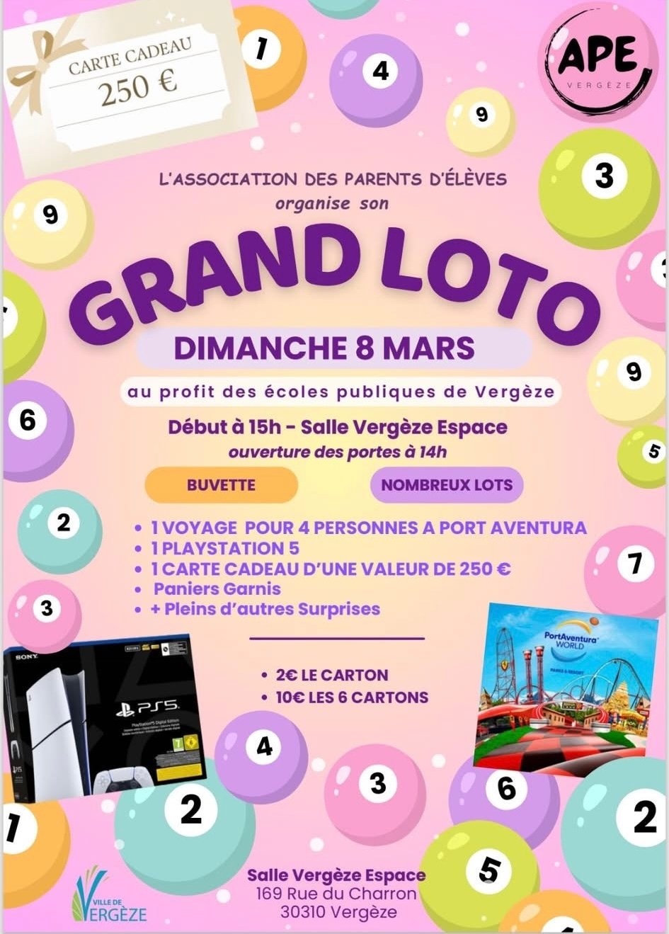 Dimanche 8 Mars 2026 🕑 14h00 : Ouverture des portes 🎉 15h00 : Début du Grand Loto 🍽️ Buvette disponible 🎁 Nombreux lots à gagner : ✈️ 1 voyage pour 4 personnes à Port Aventura 🎮 1 PlayStation 5 🎟️ 1 carte cadeau d'une valeur de 250 € 🧺 Paniers garnis 🎊 Pleins d'autres surprises